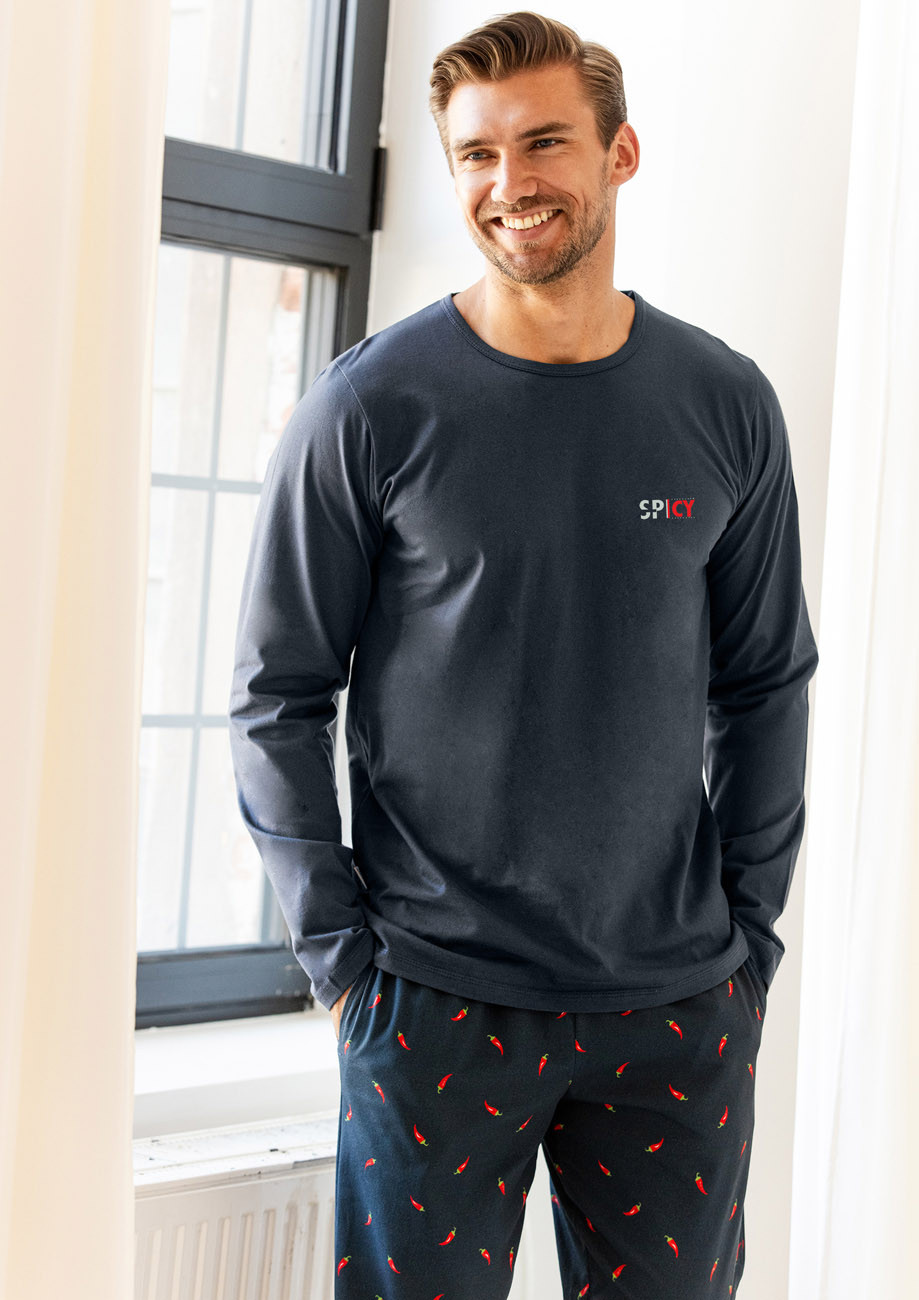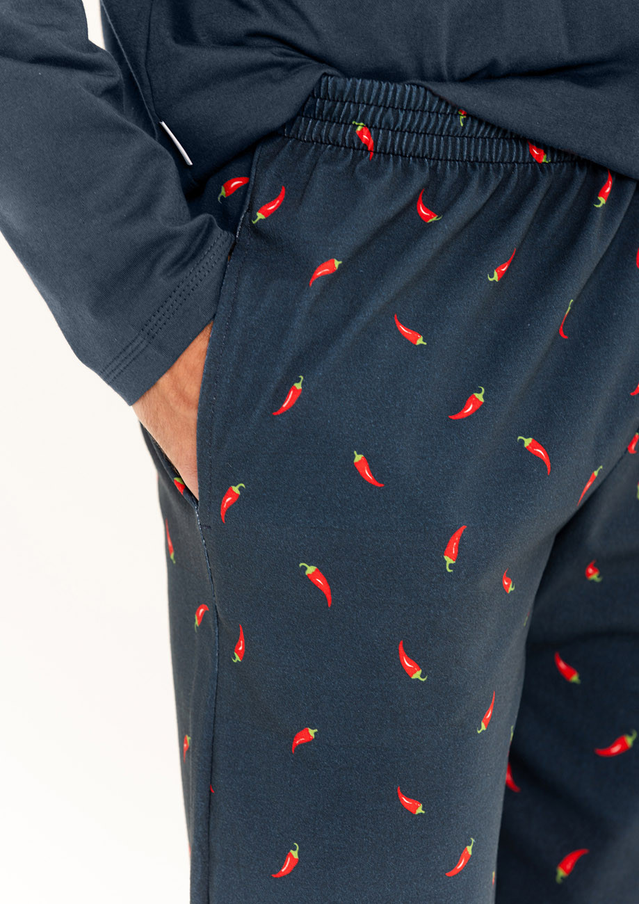 Pánske pyžamo s dlhým rukávom a dlhými nohavicami vyrobené z bavlneného úpletu, všívaná guma v páse nohavíc.