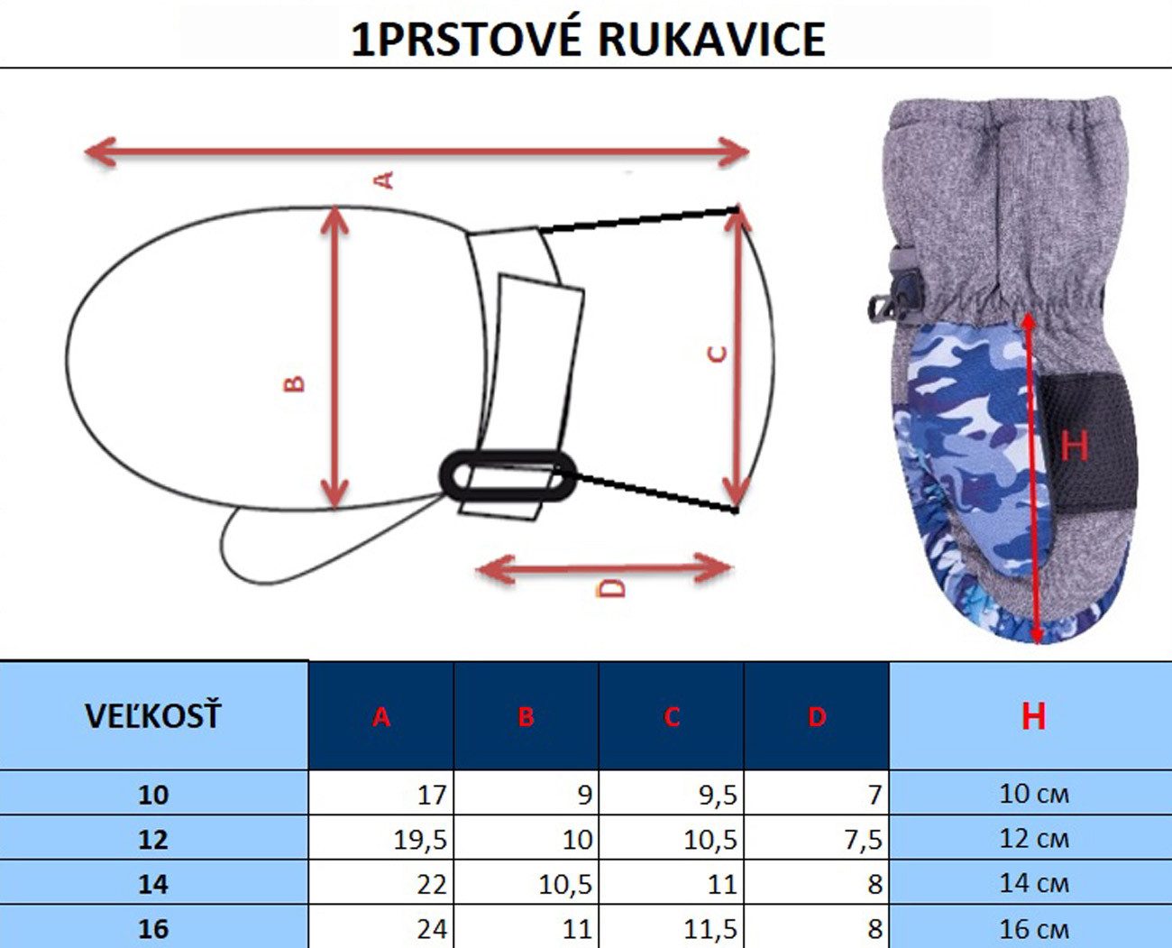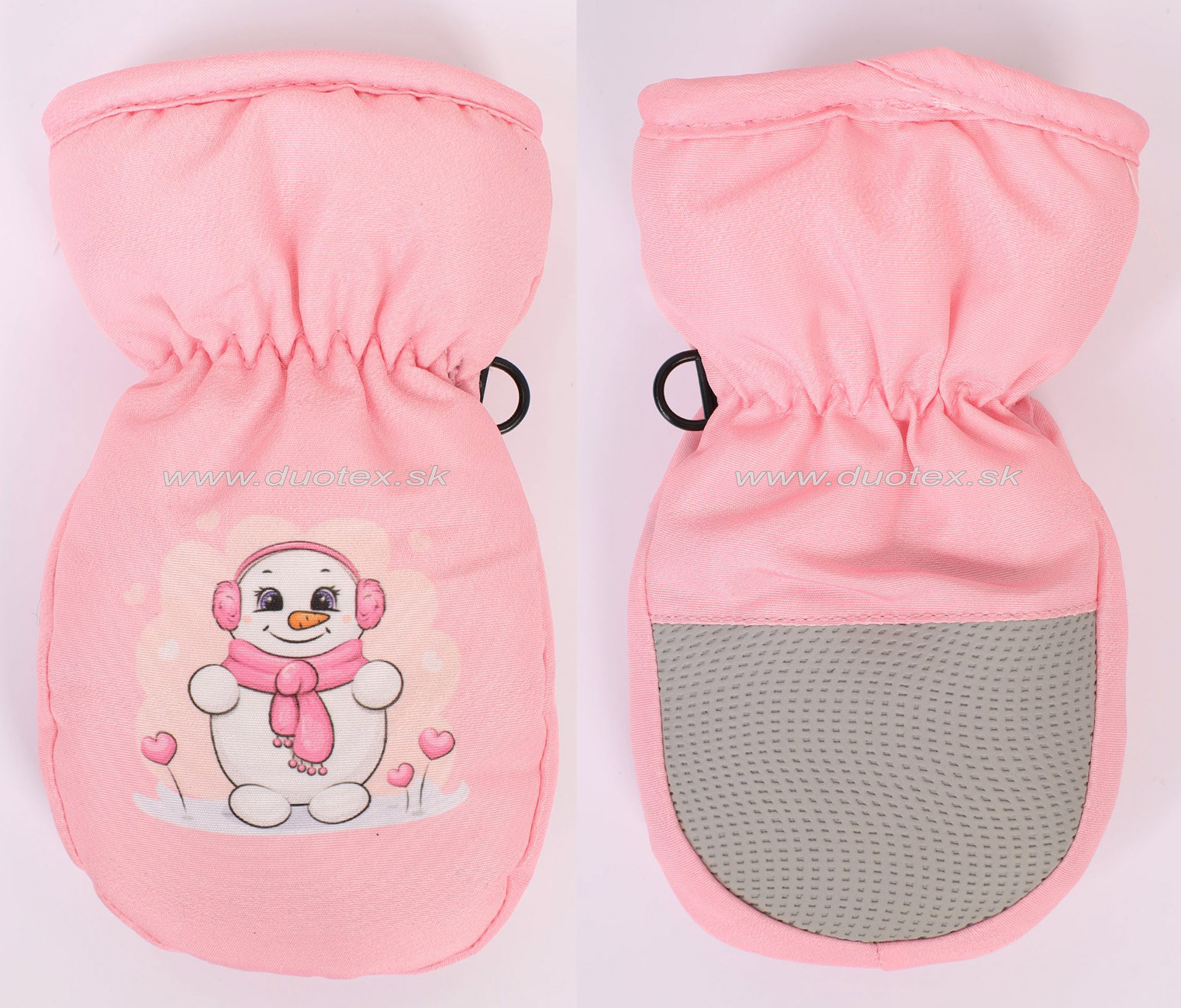 Detské teplé rukavice lyžiarského typu. Rukavičky majú vysokú manžetu a vnútro je vyteplené hrubou hrejivou vrstvou. V oblasti dlane sú opatrené pogumovaným materiálom.
