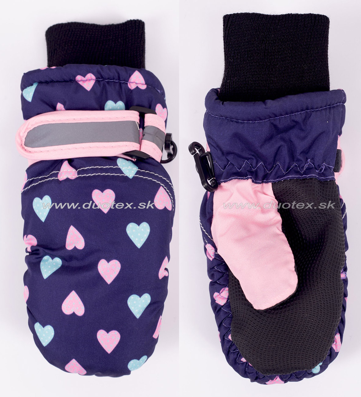 Detské teplé rukavice lyžiarského typu. Rukavičky majú vysokú manžetu a vnútro je vyteplené hrubou hrejivou vrstvou. V oblasti dlane sú opatrené pogumovaným materiálom.