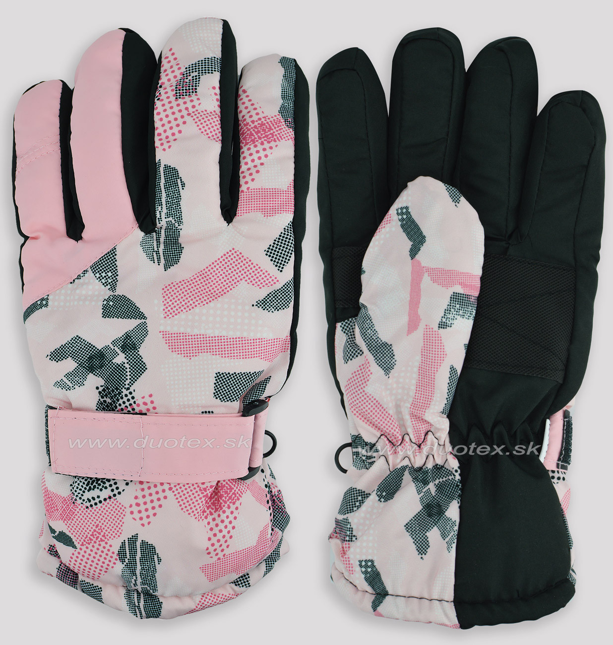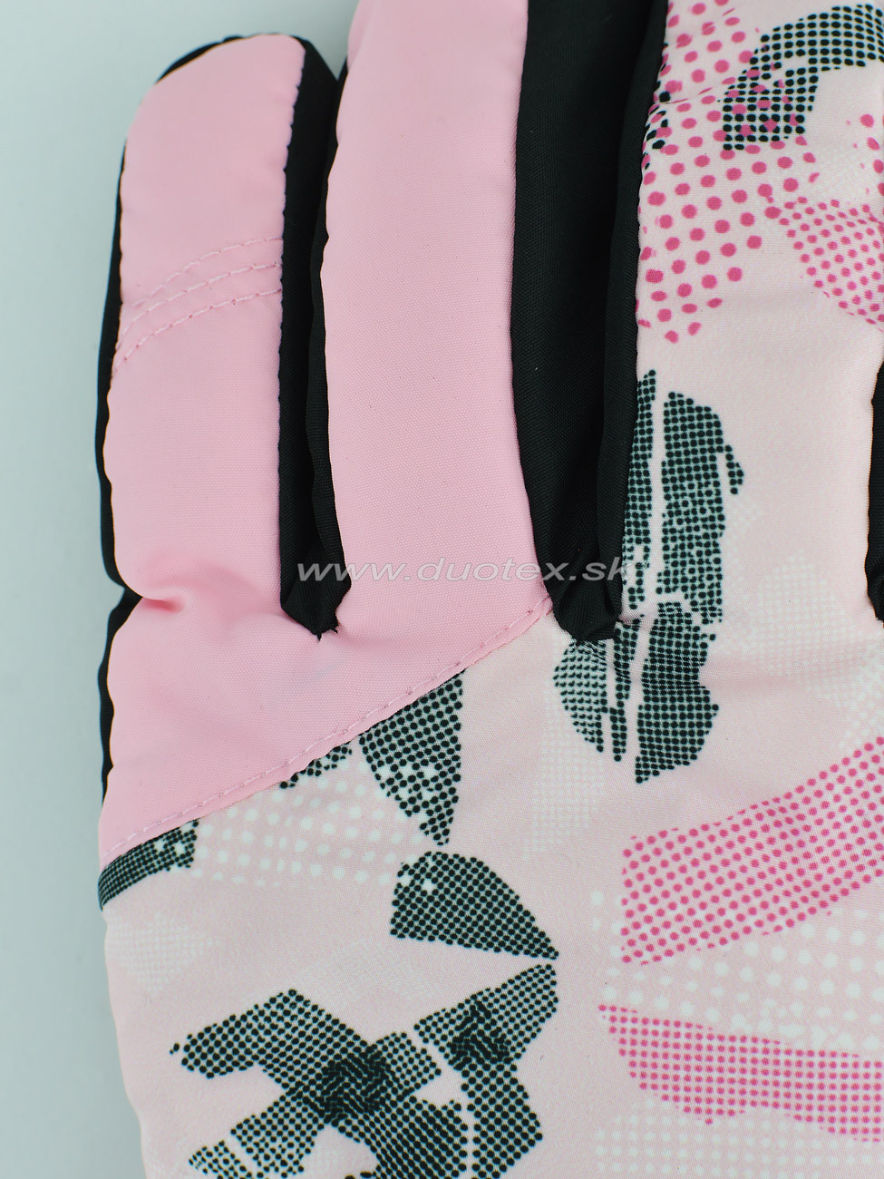 Dámske teplé rukavice lyžiarského typu. Rukavice majú elastickú manžetu a vnútro je vyteplené hrubou hrejivou vrstvou. V oblasti dlane je opatrená pogumovaným materiálom.