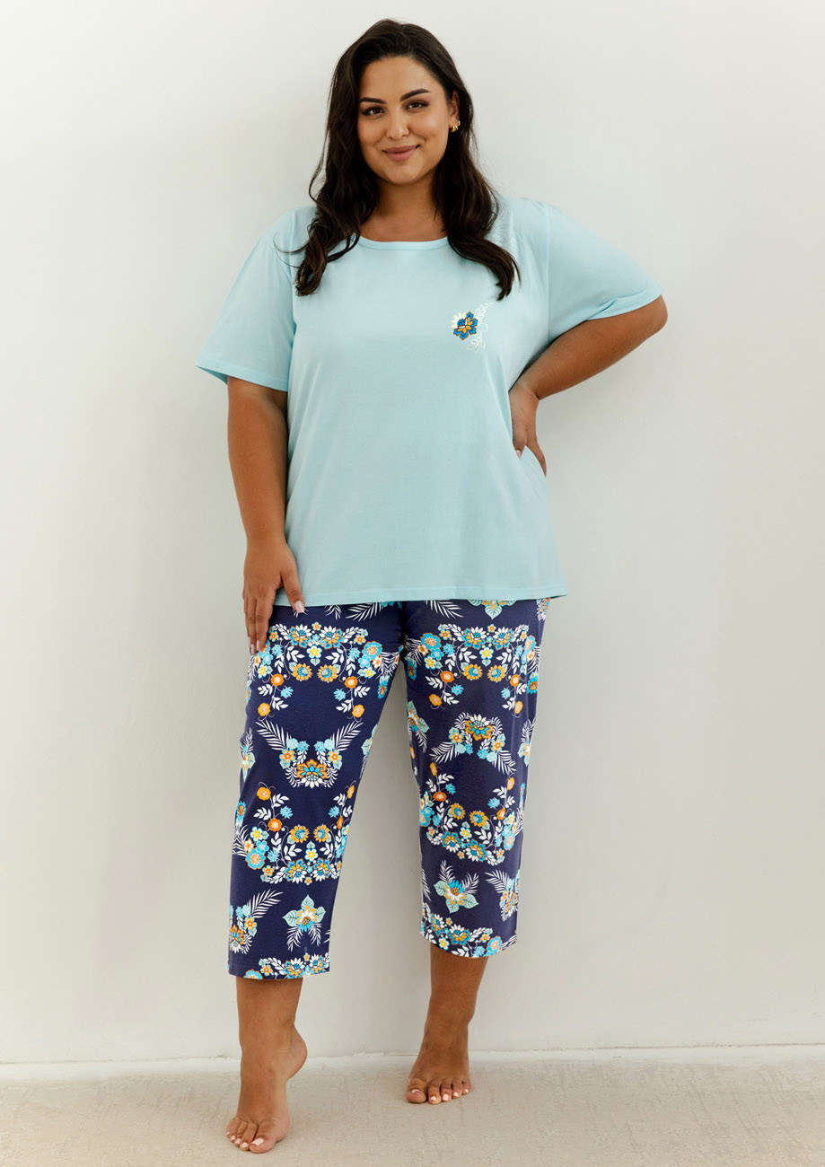 Dámske pyžamo s krátkym rukávom a 7/8 nohavicami vyrobené z úpletu zo 100% bavlny. Všívaná guma v páse nohavíc. Pyžamo je vhodné pre moletky.