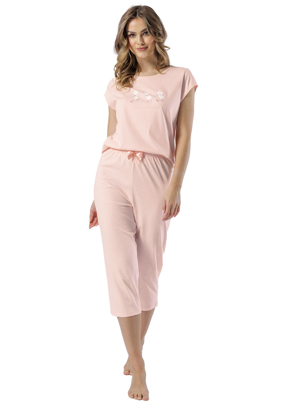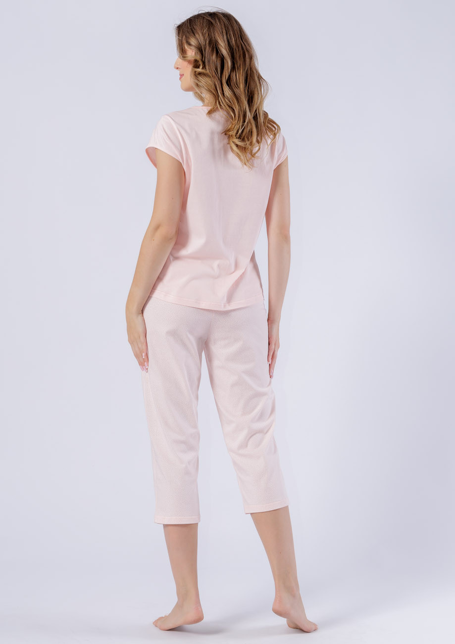 Dámske pyžamo s krátkym rukávom a 3/4 nohavicami vyrobené zo 100% bavlny, všívaná guma v páse nohavíc.