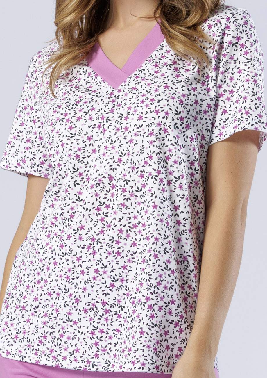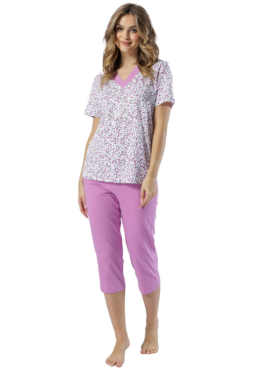 Dámske pyžamo s krátkym rukávom a 3/4 nohavicami vyrobené zo 100% bavlny, všívaná guma v páse nohavíc.