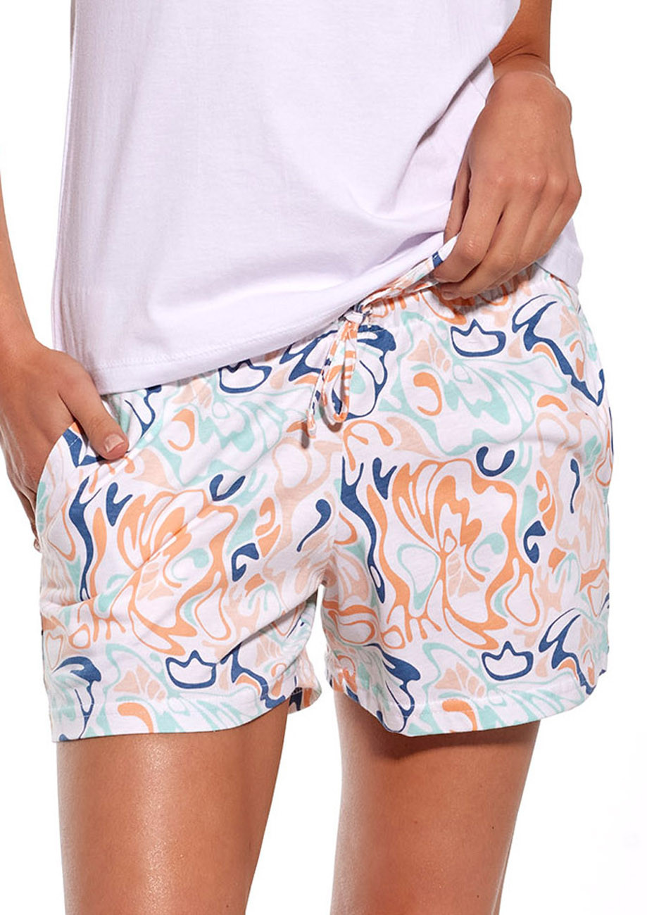 Dámske krátke pyžamové nohavice s bočnými vreckami vyrobené z úpletu zo 100% bavlny. Všívaná guma a tunel so sťahovacou šnúrkou v páse nohavíc.