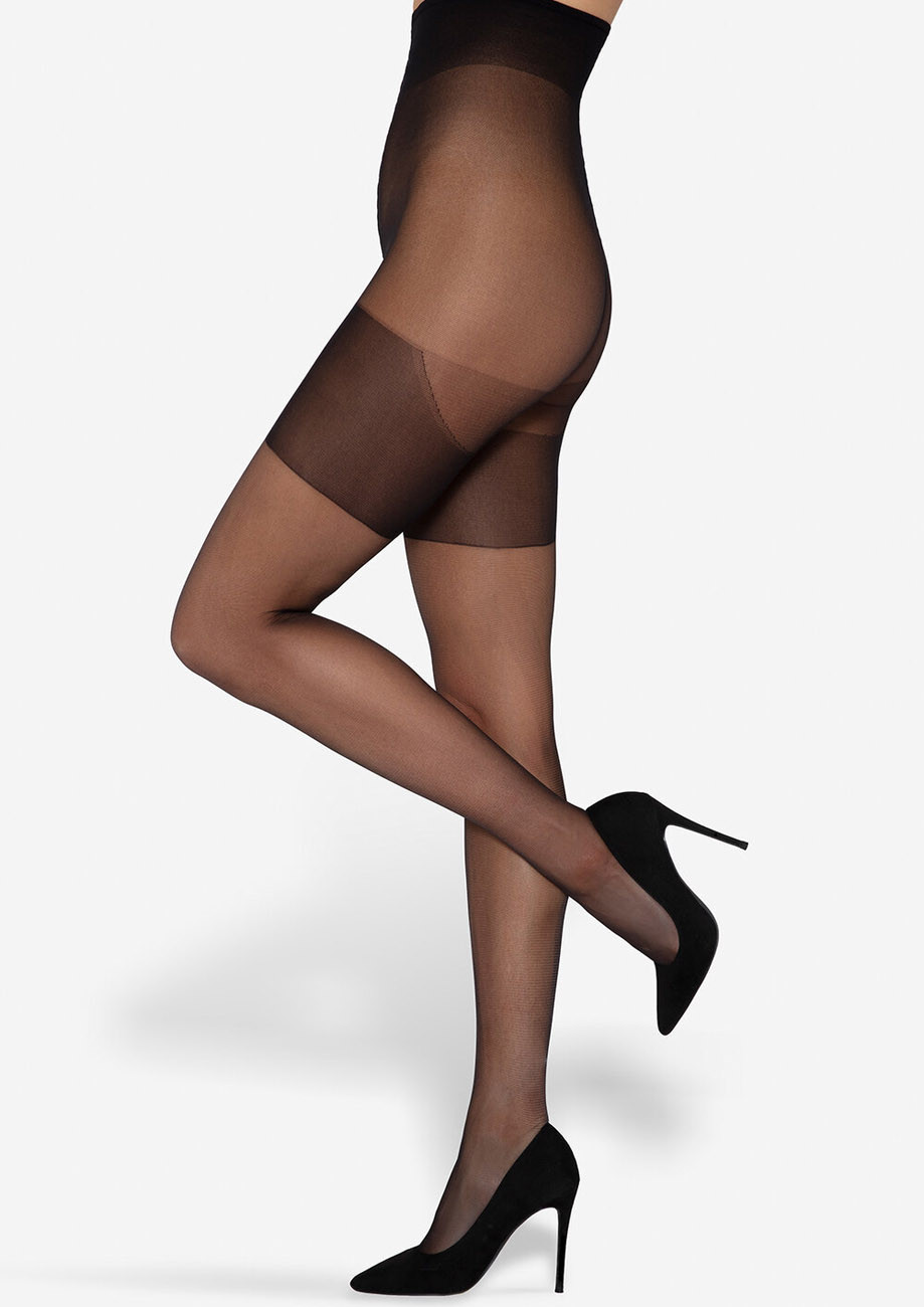 Dámske elastické polomatné pančuchové nohavice pre plnšie postavy. Priehľadná sedová časť je vyrobená z priadzí s výnimočnou pružnosťou, ktoré zaručujú pohodlné nosenie aj bez použitia veľkého klina pri obvode bokov až do 140 cm. Sú zakončené pásom so špeciálnou konštrukciou, ktorý netlačí a nezhŕňa sa. Pre vyšší komfort nosenia je predná a zadná časť sedovej časti pletená asymetricky. Spevnená časť v hornej časti stehien zvyšuje trvácnosť a komfort. S malým klinom v rozkroku, zosilnená špica, 15 den.