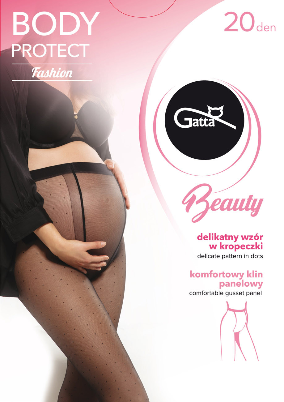 Dámske tehotenské vzorované pančuchové nohavice. Moderný dizajn s panelovým klinom vpredu a bočnými švami sa prispôsobí rastúcemu brušku a meniacej sa postave počas tehotenstva. Toto riešenie zabraňuje stlačeniu brucha. Jemná priadza použitá v tomto modeli zaručí pohodlie a komfort počas celého dňa. Bočné švy nedráždia, sú flexibilné a zaisťujú budúcim mamičkám komfort pri nosení. Bez zosilnenej špičky, 20den.
