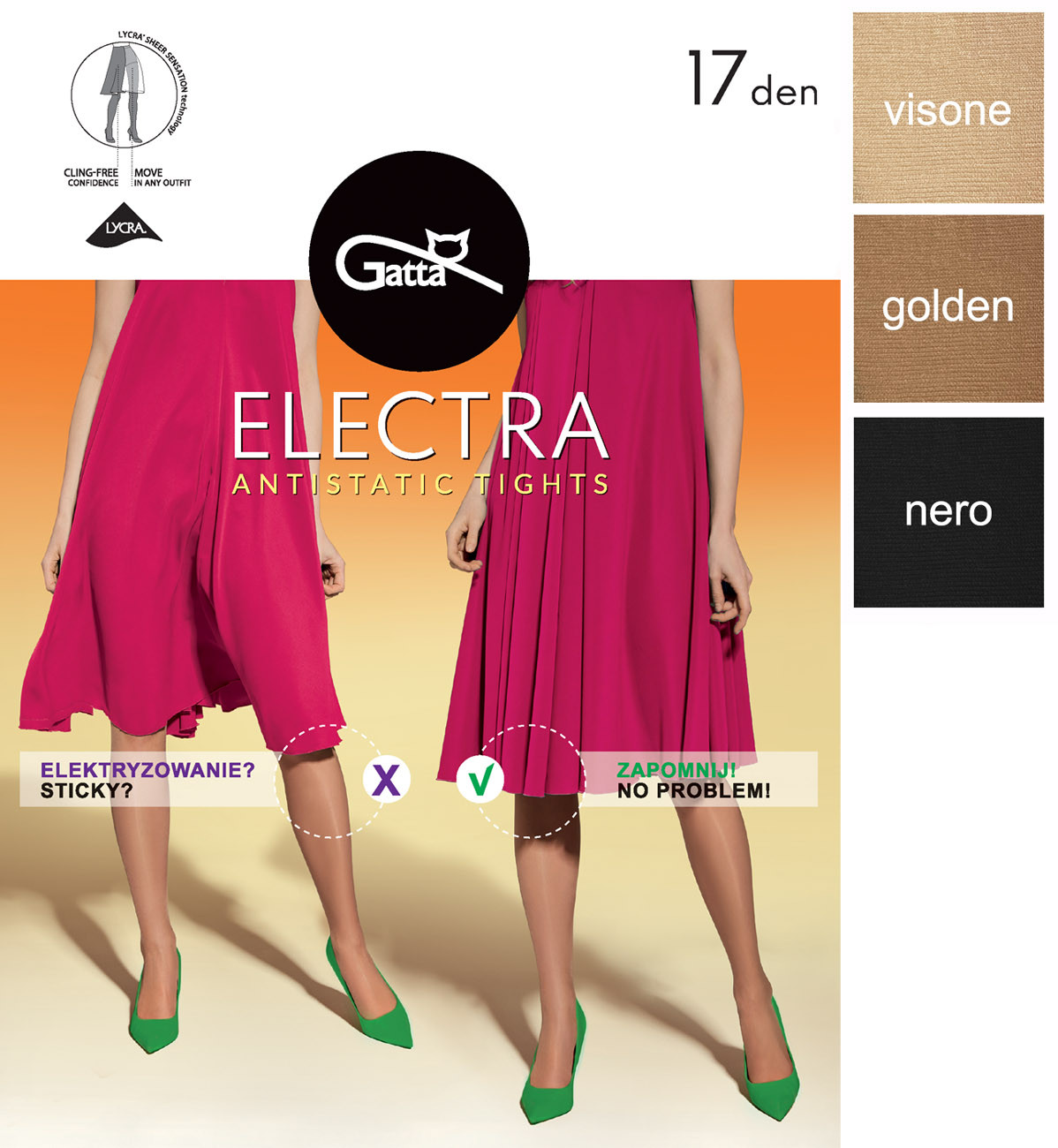 Dámske polomatné pančuchové nohavice vyrobené z inovatívneho vlákna, ktoré znižuje statickú elektrinu o viac ako 80% a tým zabraňuje elektrizovaniu a lepeniu oblečenia. Sú vhodné najmä pod šaty a sukne. Širší lem v páse, zosilnený sed a špica zaručujú pohodlie pri nosení, 17den