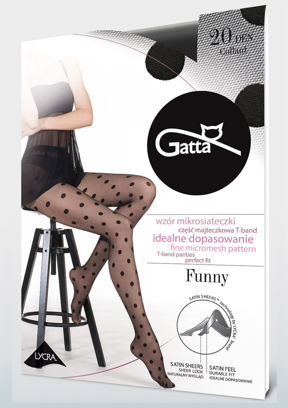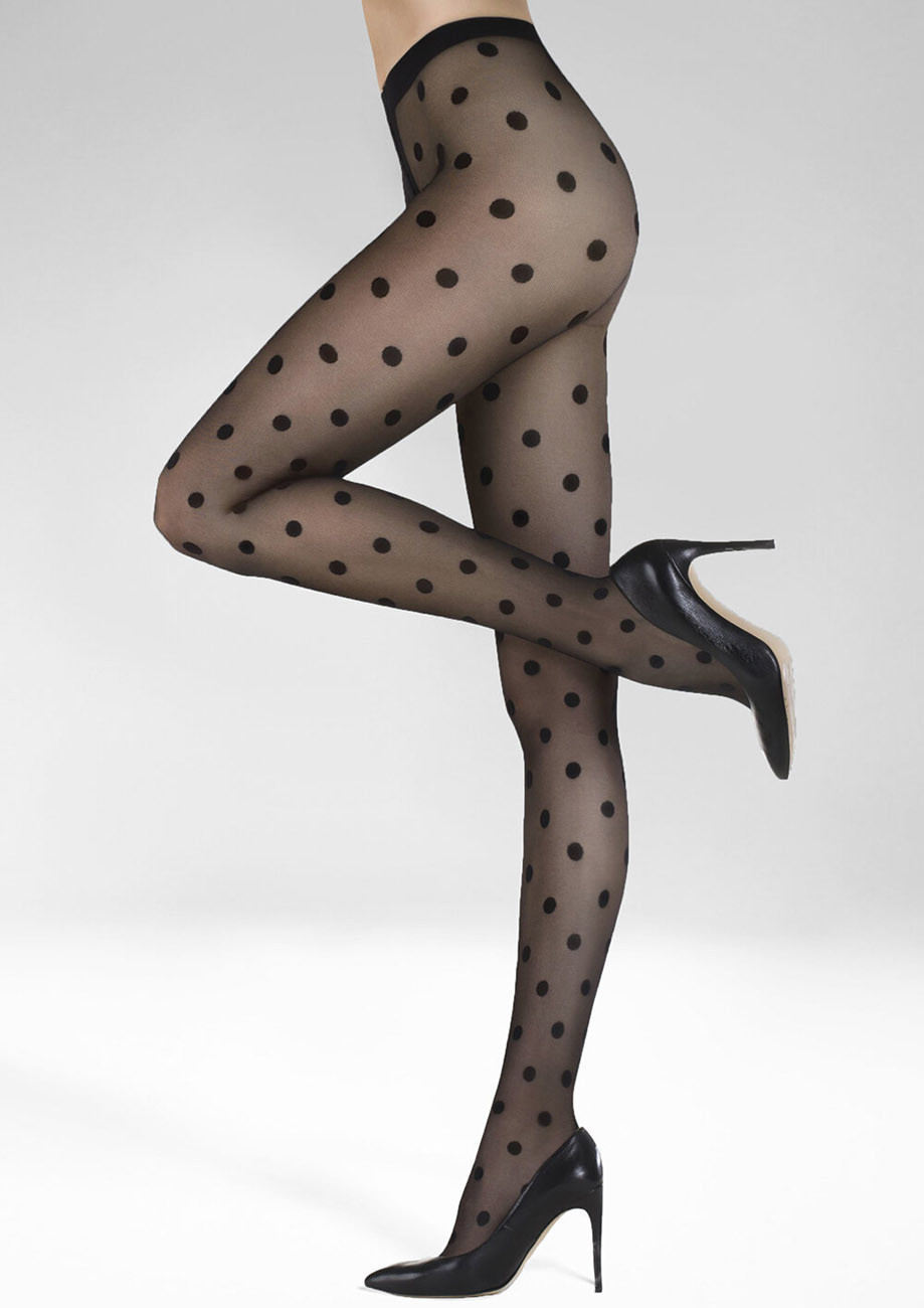Dámske jemne sieťované pančuchové nohavice s bodkovaným vzorom. Bez zosilneného sedu (zosilnenie iba pri šve - v tvare T), bez zosilnenej špice, 20den