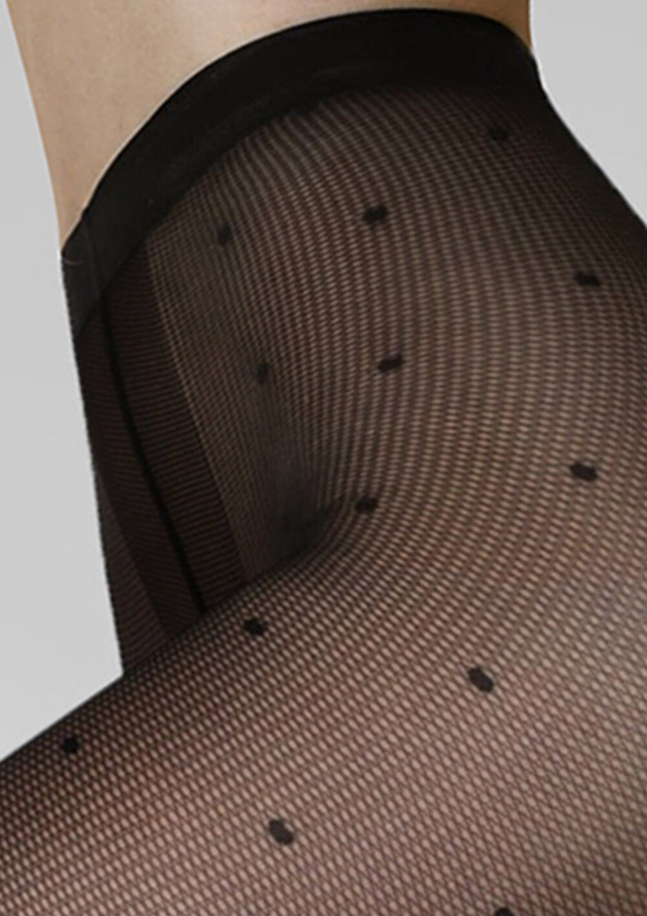 Dámske jemne sieťované pančuchové nohavice s bodkovaným vzorom. Bez zosilneného sedu (zosilnenie iba pri šve - v tvare T), bez zosilnenej špice, 20den