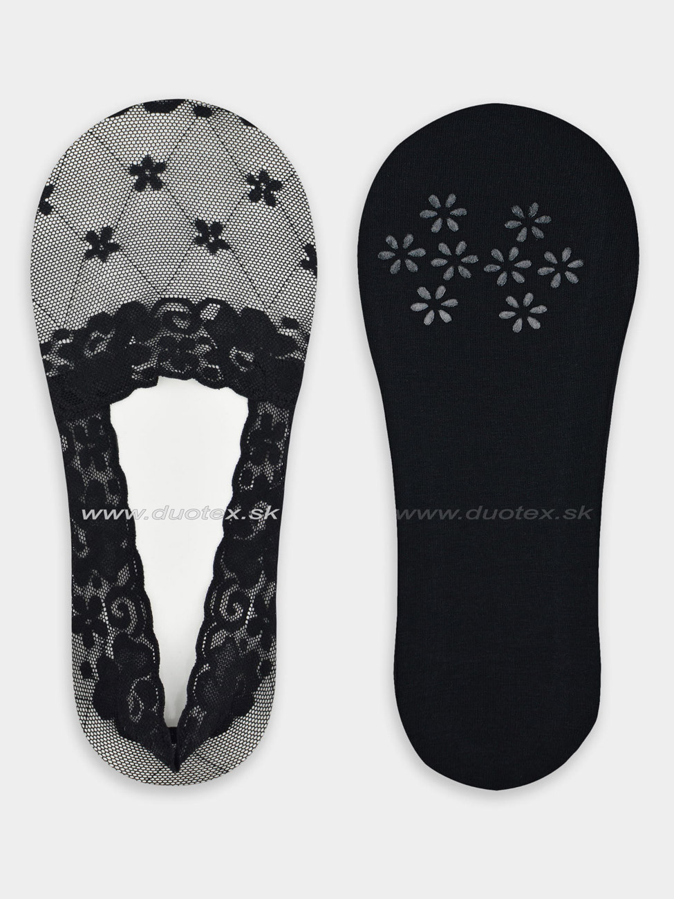 Dámske efektné jednofarebné krajkové šľapky. Spodná časť je vyhotovená z bavlneného úpletu s ABS proti šmýkaniu v obuvi. Silokónový prúžok v oblasti päty a po bokoch fixuje ponožku proti posuvu.
