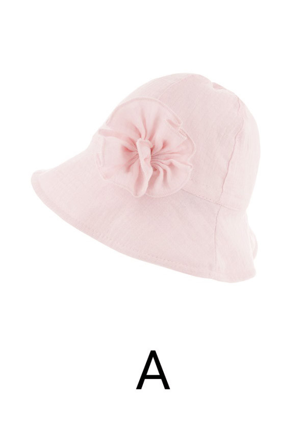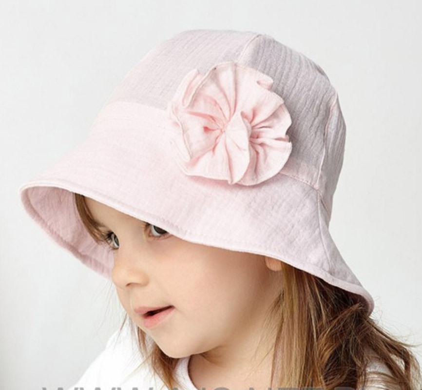 Detský letný klobúčik vyrobený z tenkej bavlnenej tkaniny v zadnej časti stiahnutý do gumičky.