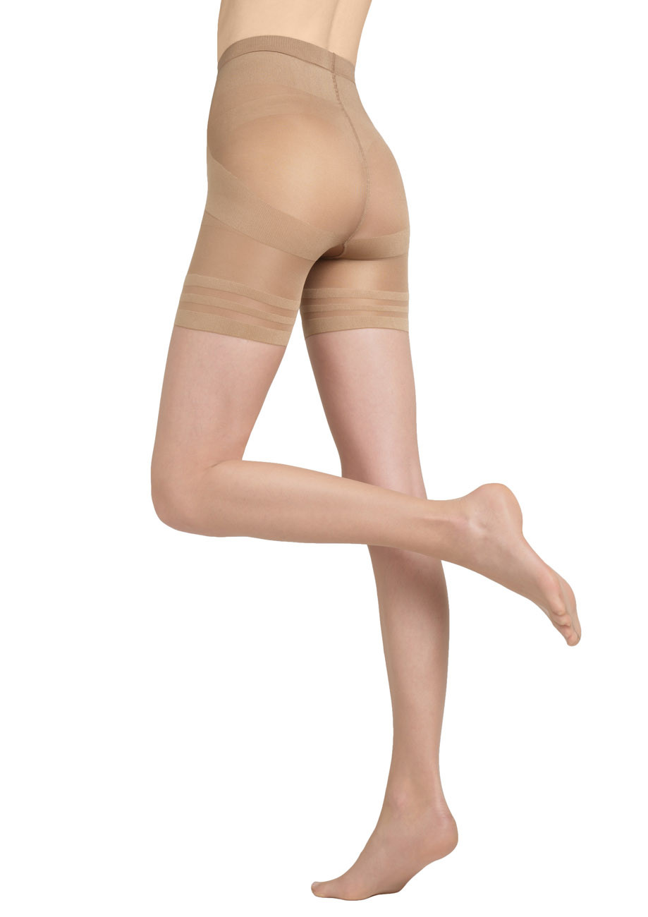 Dámske jemné pančuchové nohavice, vyrobené z moderného vlákna LYCRA FUSION, ktoré má zvýšenú odolnosť voči zatiahnutiu. Vďaka špeciálnej predĺženej konštrukcii v stehennej časti sa dokonale prispôsobia telu, korigujú tvar ženskej postavy, zoštíhľujú stehná a modelujú líniu zadku, brucha, bokov a stehien. Majú ploché švy a netlačiacu gumu. Bavlnený hygienický klin umožňuje nosiť tieto skvelé pančuchové nohavice aj bez použitia nohavičiek.
