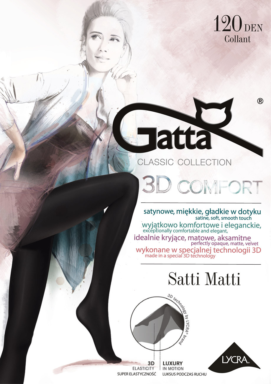 Dámske elegantné, matné a krycie pančuchové nohavice vyrobené z inovačnej priadze LYCRA 3D. Zamatové a mäkké na dotyk, bez zosilneného sedu s všitým bavlneným klinom, 120den.