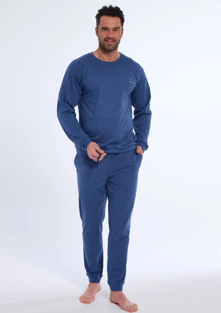 Pánske pyžamo s dlhým rukávom a dlhými nohavicami s bočnými vreckami. Všívaná guma v páse nohavíc. Spodná časť vrchného dielu, rukávov a nohavíc je stiahnutá do pružného lemu.