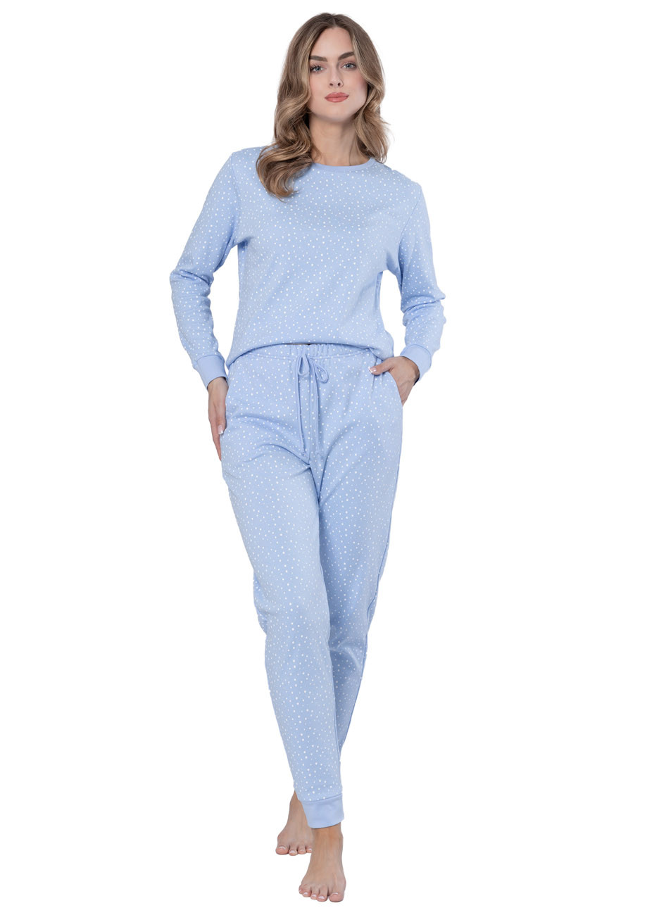Dámske pyžamo s dlhými rukávmi a dlhými nohavicami s bočnými vreckami vyrobené zo 100% bavlny. Vrchný aj spodný diel je ukočený pružným patentom. V páse nohavíc je všívaná guma.