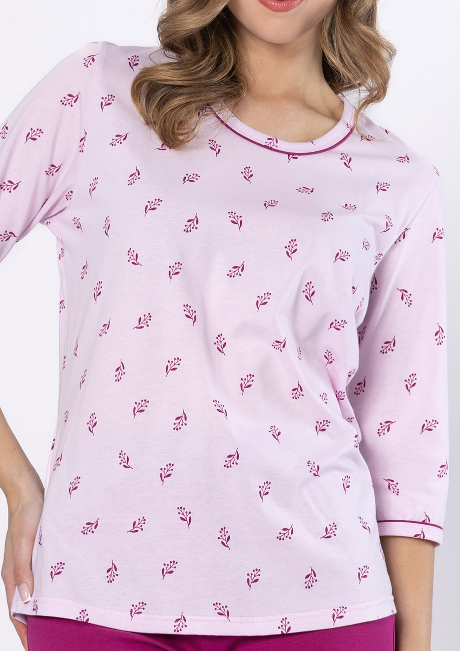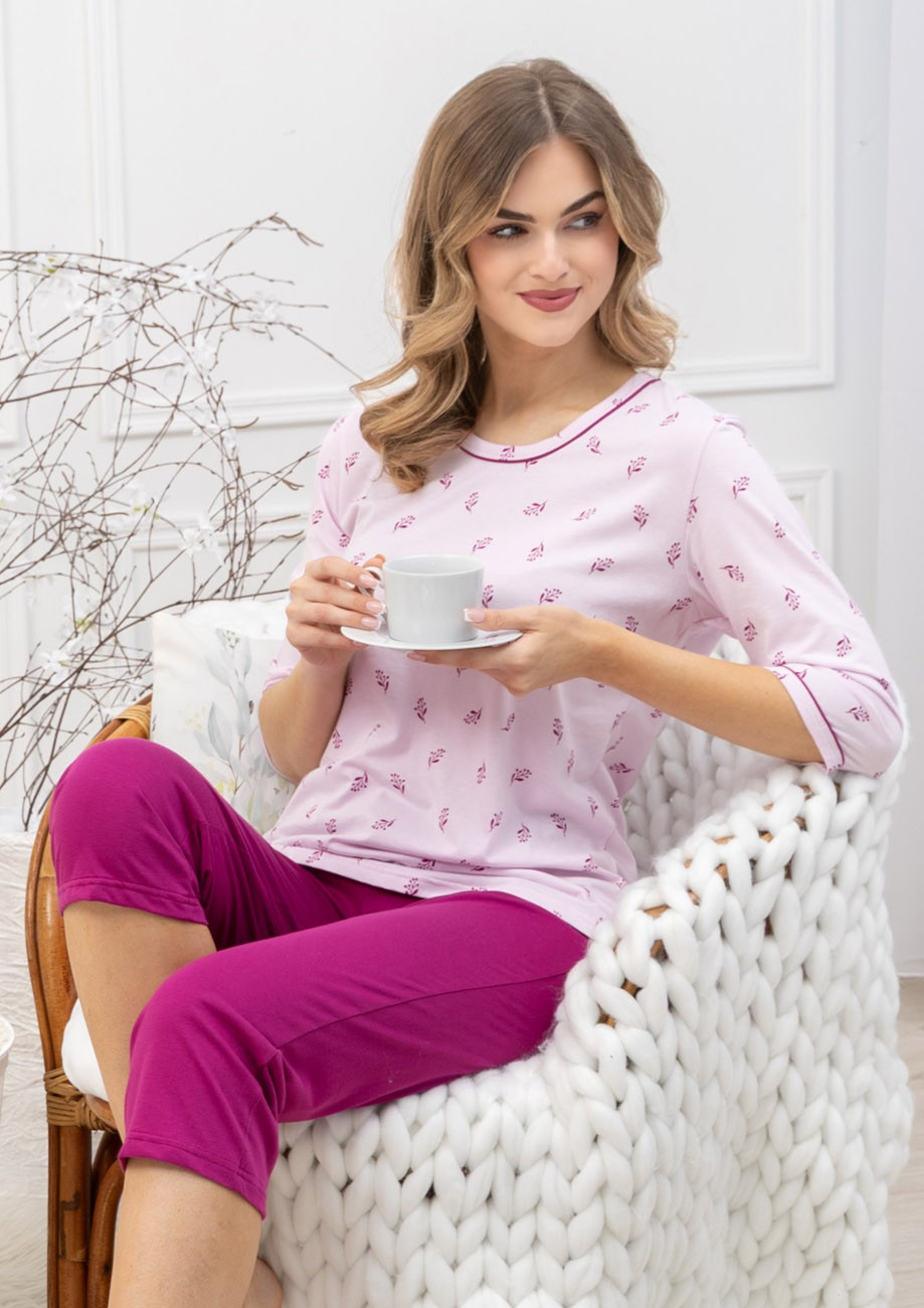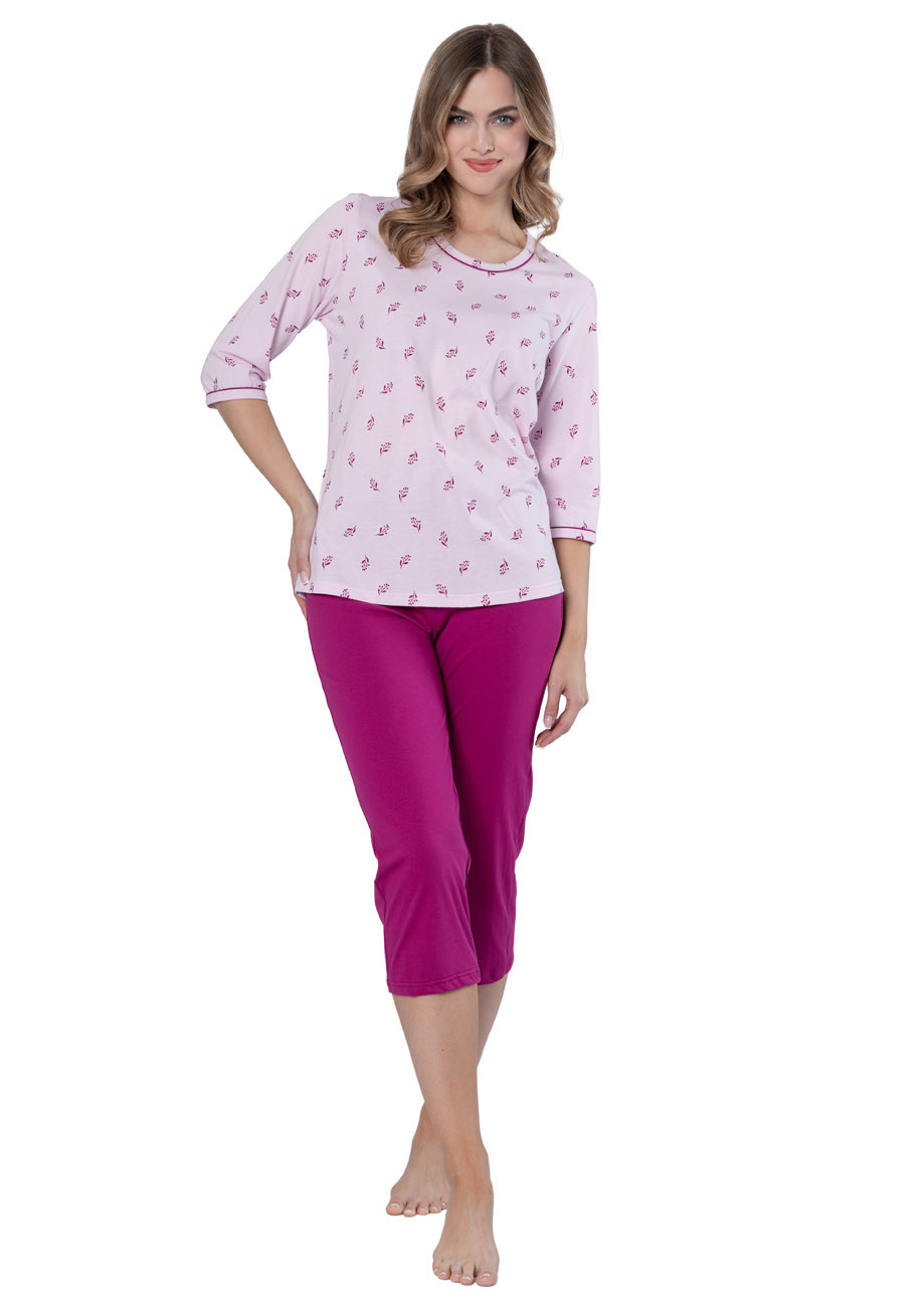 Dámske pyžamo s 3/4 rukávom a 3/4 nohavicami vyrobené zo 100% bavlny, všívaná guma v páse nohavíc.