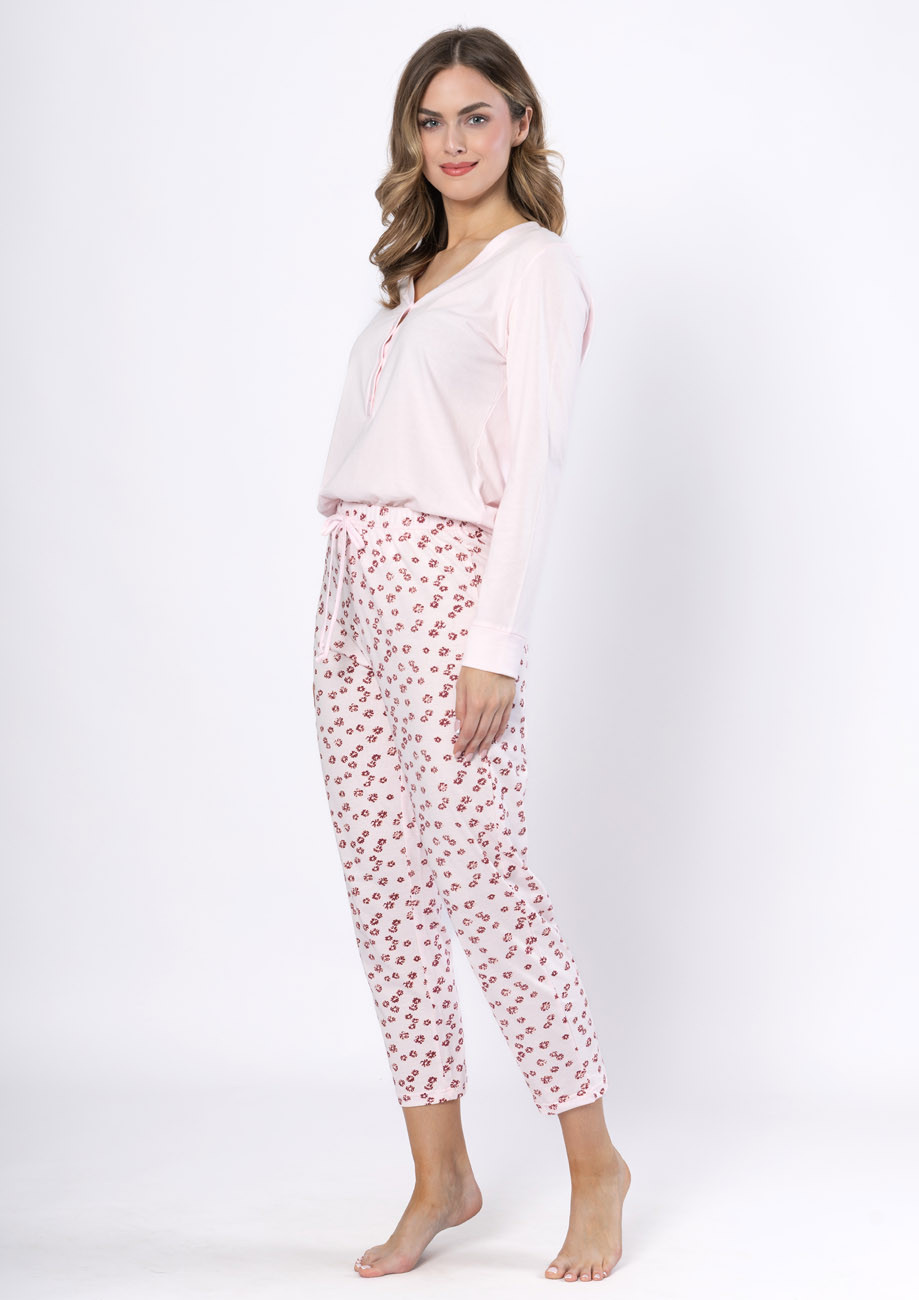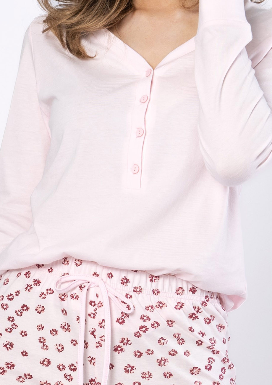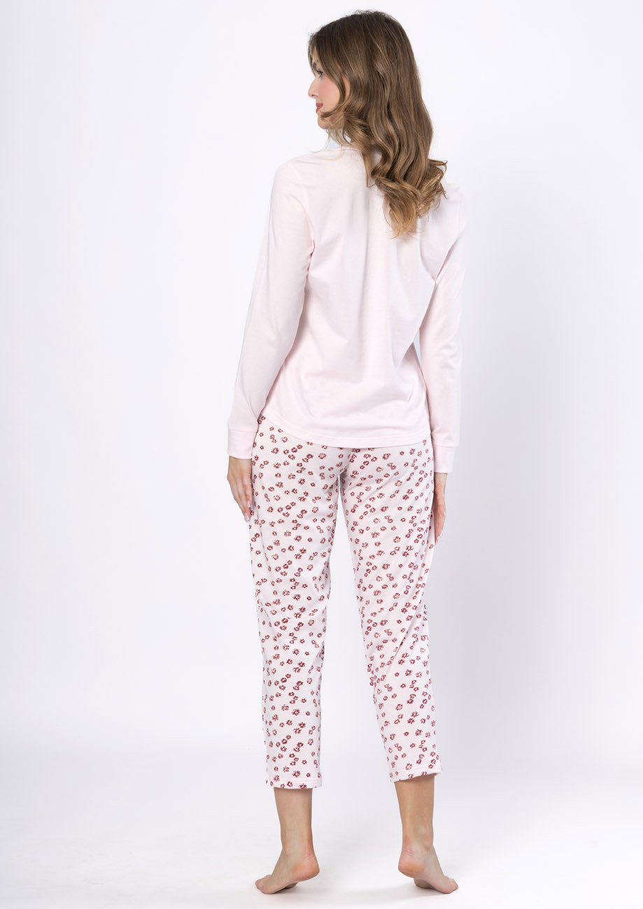 dámske pyžamo s dlhými rukávmi a dlhými nohavicami vyrobené zo 100% bavlny. Pyžamo je vyhotovené s légou na zapínanie a s všívanou gumou v páse nohavíc.