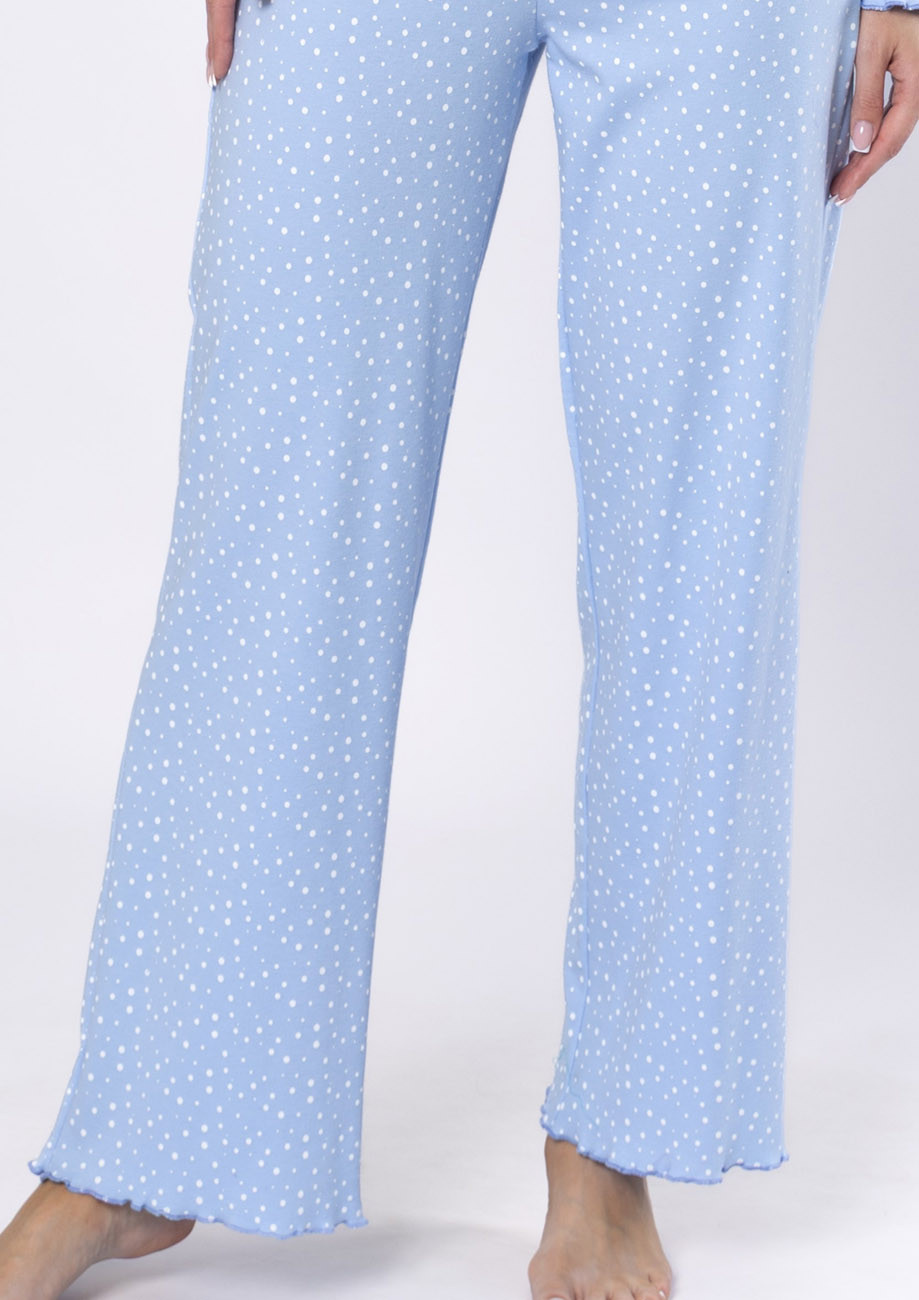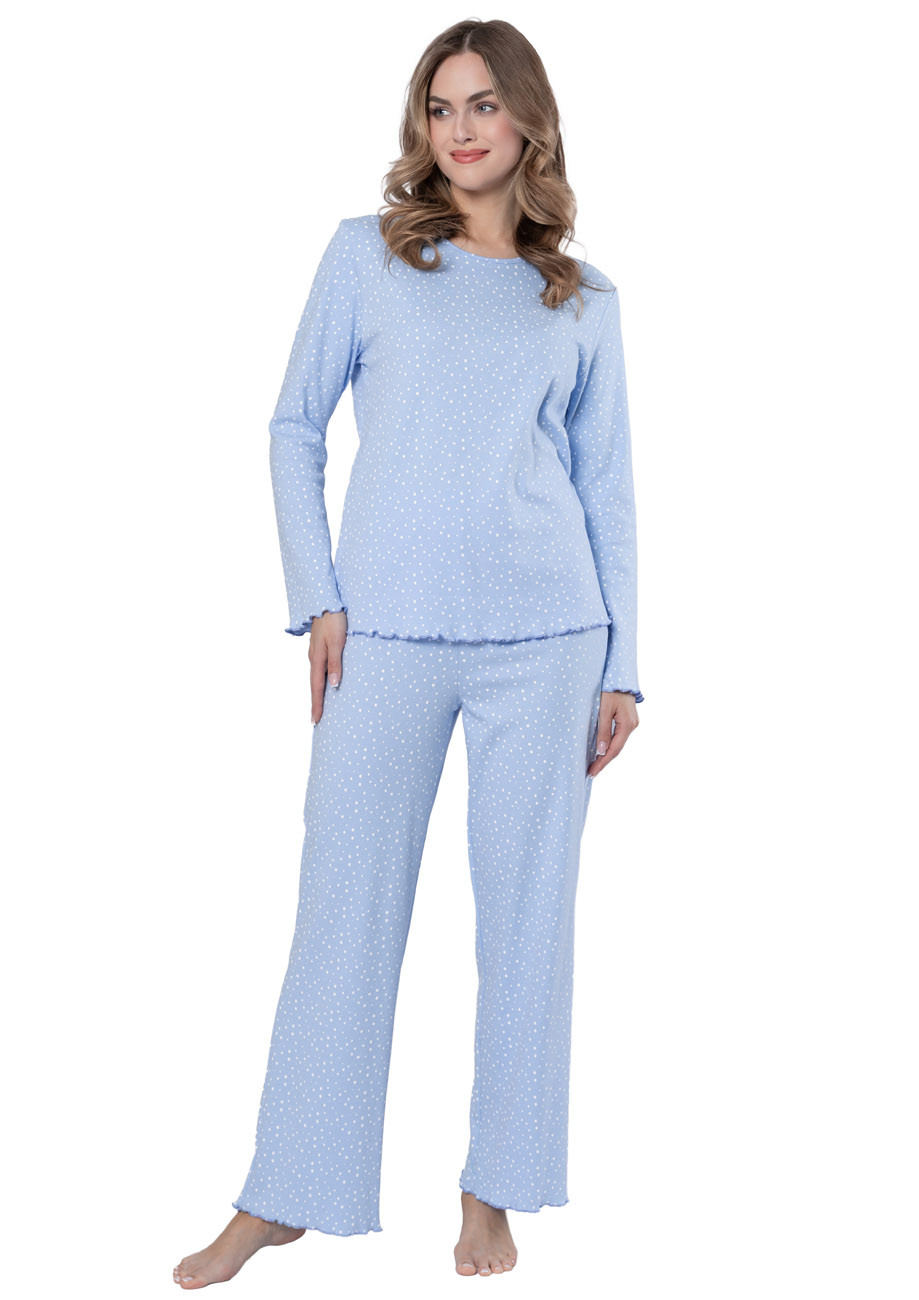 dámske pyžamo s dlhými rukávmi a dlhými nohavicami vyrobené zo 100% bavlny. Vrchná časť pyžama, rukávy aj nohavice sú ukončené ozdobným lemom