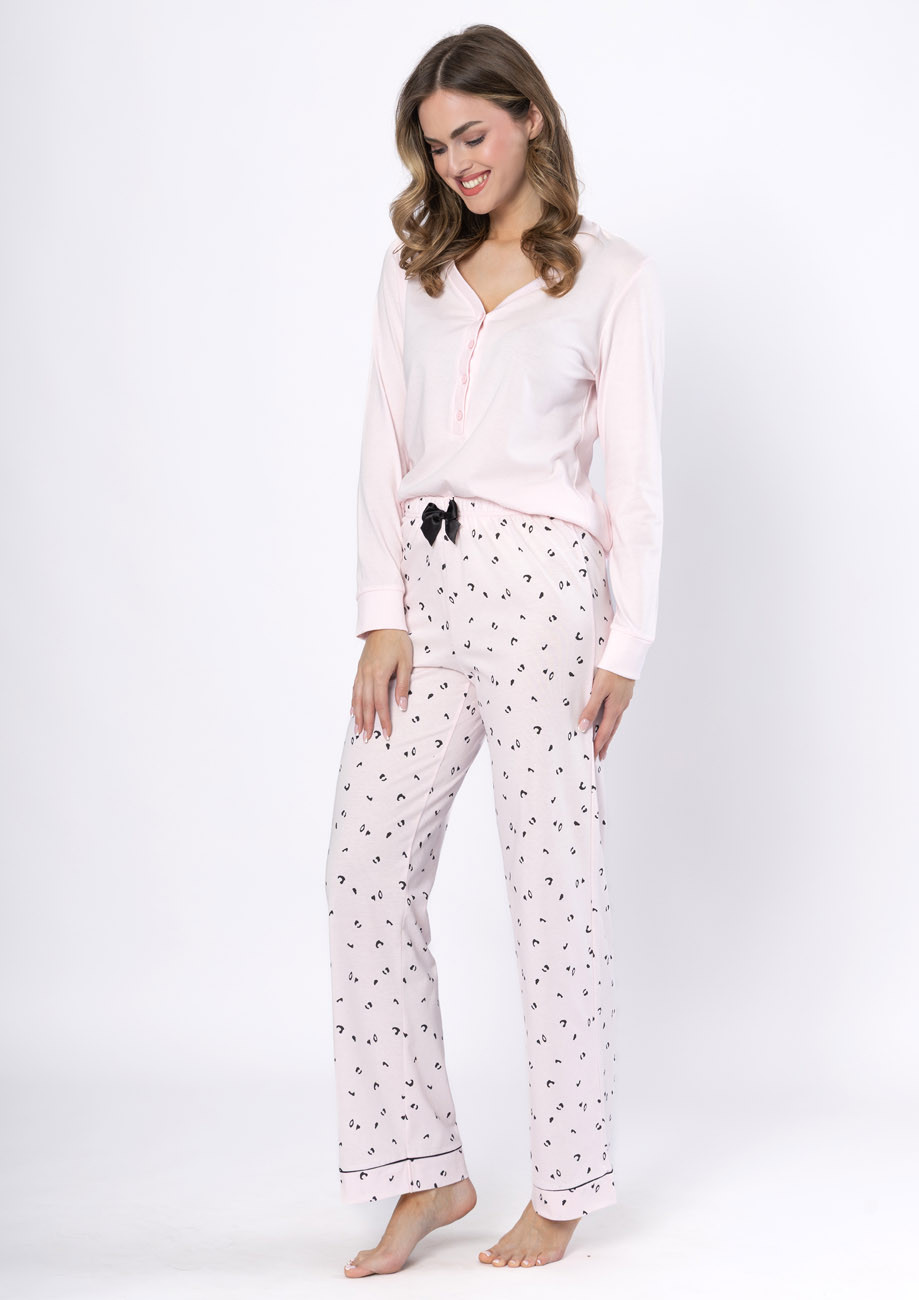 dámske pyžamo s dlhými rukávmi a dlhými nohavicami vyrobené zo 100% bavlny. Pyžamo je vyhotovené s légou na zapínanie a s všívanou gumou v páse nohavíc.