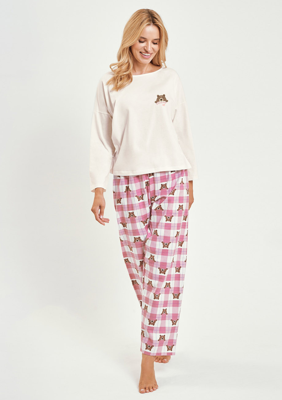 Dámske pyžamo s dlhým rukávom a dlhými nohavicami vyrobené zo 100% bavlneného úpletu - všívaná guma v páse nohavíc