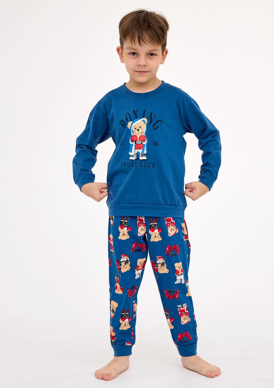 Chlapčenské pyžamo s dlhým rukávom a dlhými nohavicami, spodná časť rukávov a nohavíc stiahnutá do pružného lemu, všívaná široká guma v páse nohavíc.