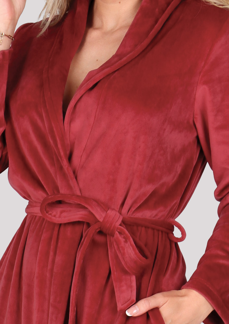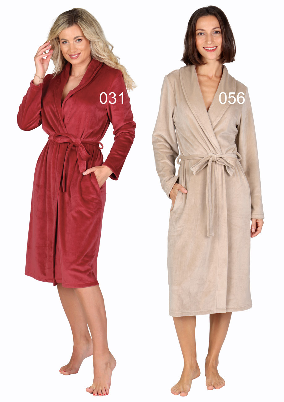 Dámsky dlhý zavinovací župan so šálovým golierom vyhotovený z mäkkého tenkého postrihovaného plyšu, všívané bočné vrecká