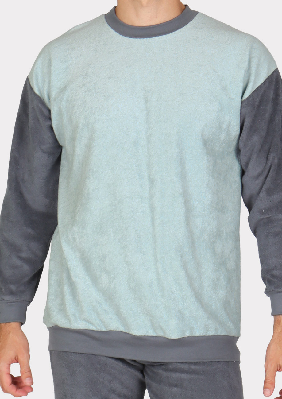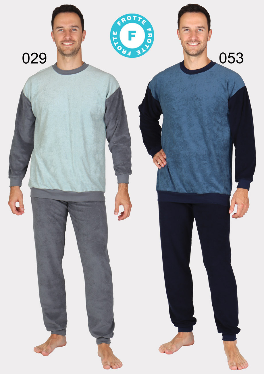 Pánske froté pyžamo s dlhým rukávom a dlhými nohavicami, navliekaná guma v páse nohavíc.