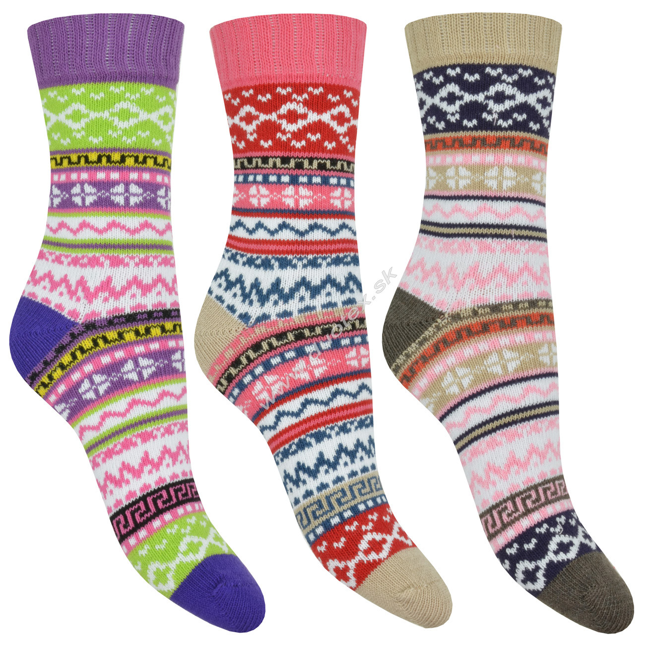 Dámske teplé tradičné zimné ponožky s obľúbeným severským - nórskym vzorom. Ponožky sú vyhotovené s vysokým obsahom bavlny. Trojpack sa skladá z troch párov rôznych farieb - viď. obrázok.