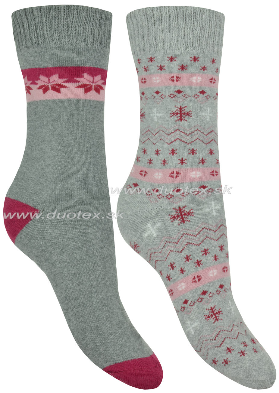 Dámske teplé zimné ponožky s obľúbeným severským - nórskym vzorom. Predávajú sa ako dvojpack, ktorý sa skladá z 2 párov ponožiek rôznych vzorov i farieb - viď obrázok.
