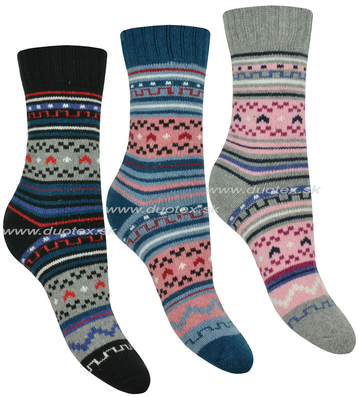 dámske vzorované zimné ponožky. Predávajú sa ako trojpack, ktorý sa skladá z 3 párov ponožiek rôznych vzorov i farieb - viď obrázok.