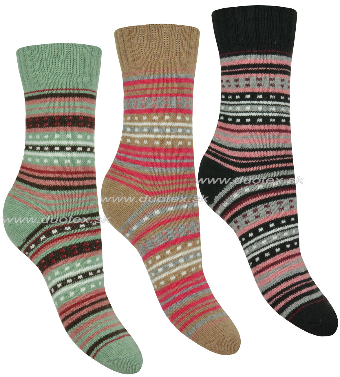 dámske vzorované zimné ponožky. Predávajú sa ako trojpack, ktorý sa skladá z 3 párov ponožiek rôznych vzorov i farieb - viď obrázok.