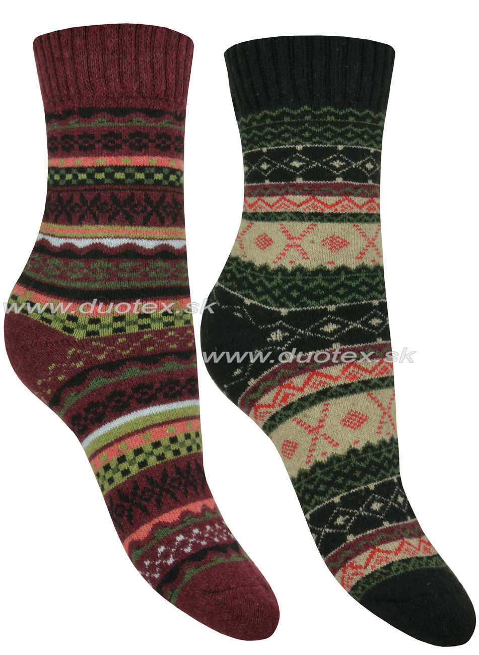 Dámske teplé zimné ponožky s obľúbeným severským - nórskym vzorom. Ponožky sú vyhotovené s vysokým podielom hrejivej vlny a froté vrstvou vo vnútri ponožky. Predávajú sa ako dvojpack, ktorý sa skladá z 2 párov ponožiek rôznych vzorov i farieb - viď obrázok. Dva páry ponožiek vo zväzku sú spojené jednou etiketou.