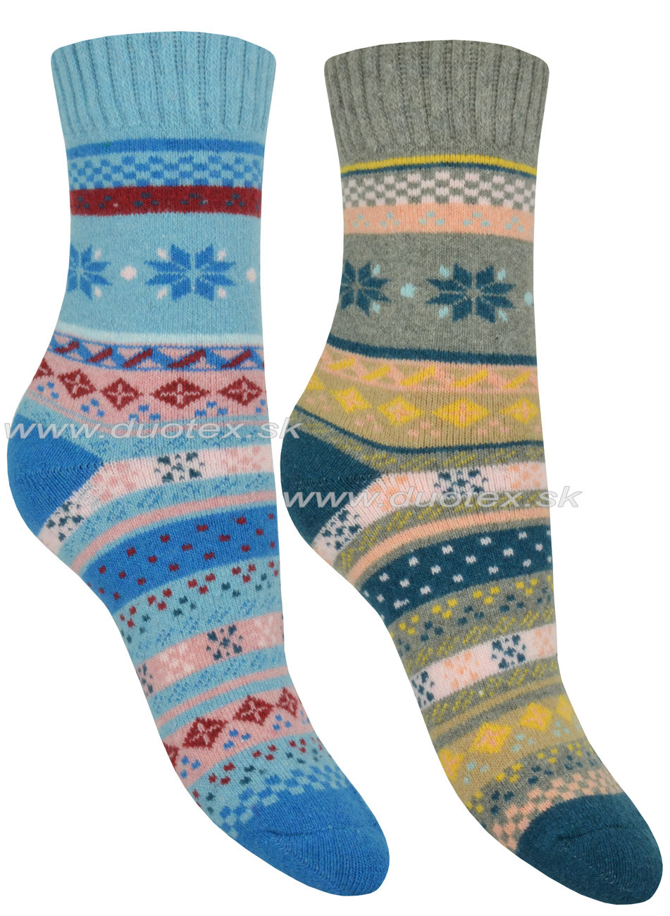 Dámske teplé zimné ponožky s obľúbeným severským - nórskym vzorom. Ponožky sú vyhotovené s vysokým podielom hrejivej vlny a froté vrstvou vo vnútri ponožky. Predávajú sa ako dvojpack, ktorý sa skladá z 2 párov ponožiek rôznych vzorov i farieb - viď obrázok. Dva páry ponožiek vo zväzku sú spojené jednou etiketou.