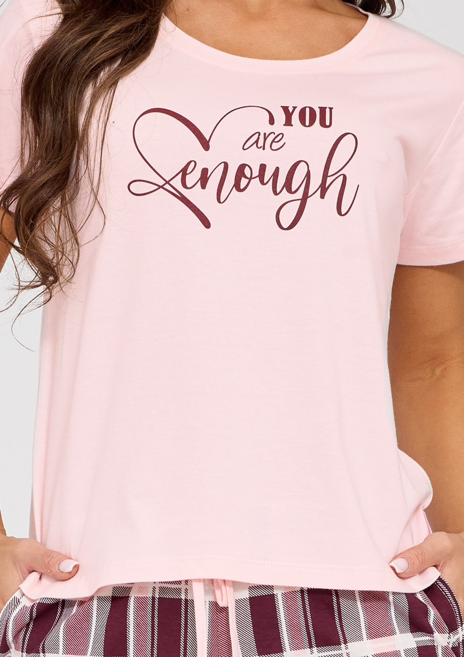 Dámske pyžamo s krátkym rukávom a krátkymi nohavicami vyrobené z úpletu zo 100% bavlny. Všívaná guma v páse nohavíc.
