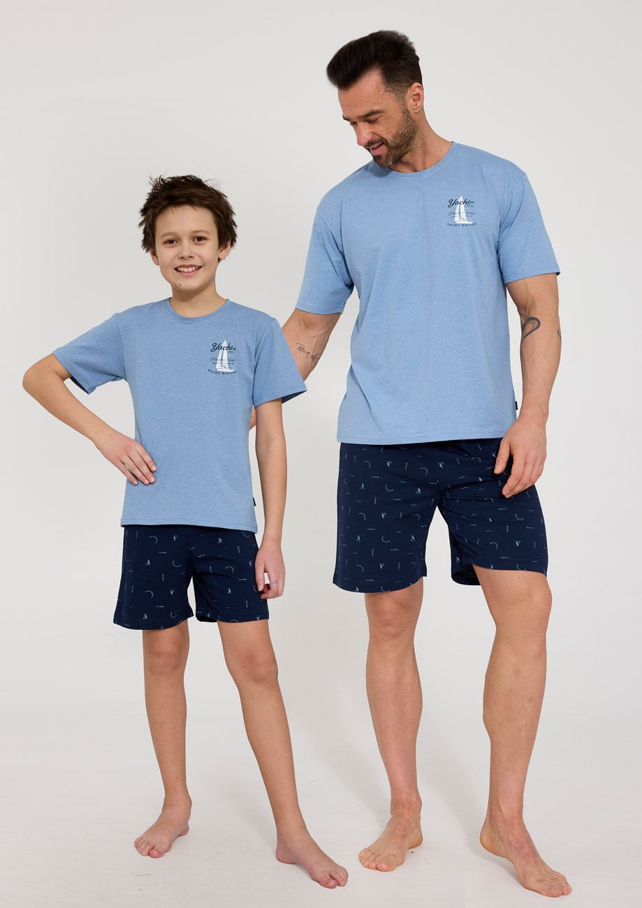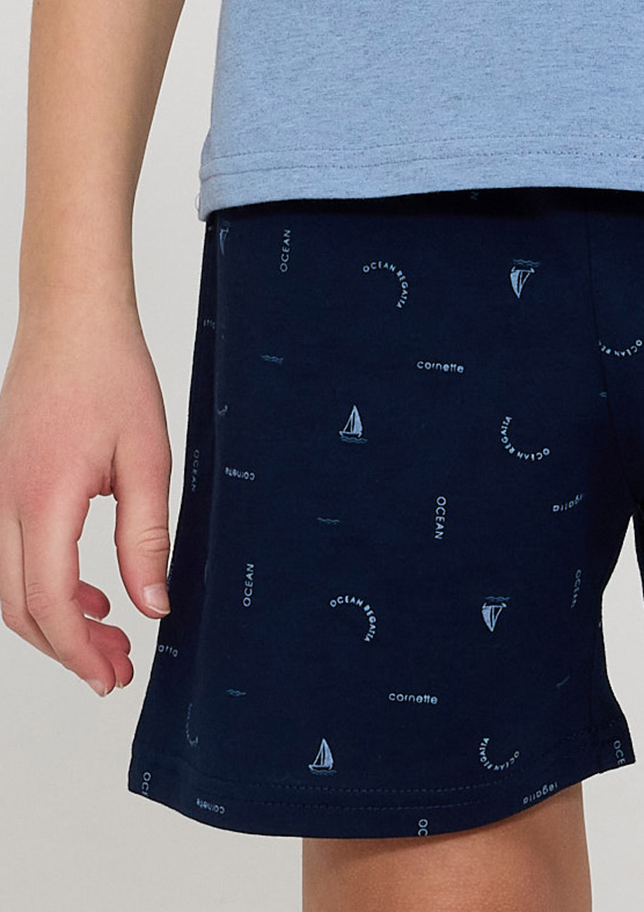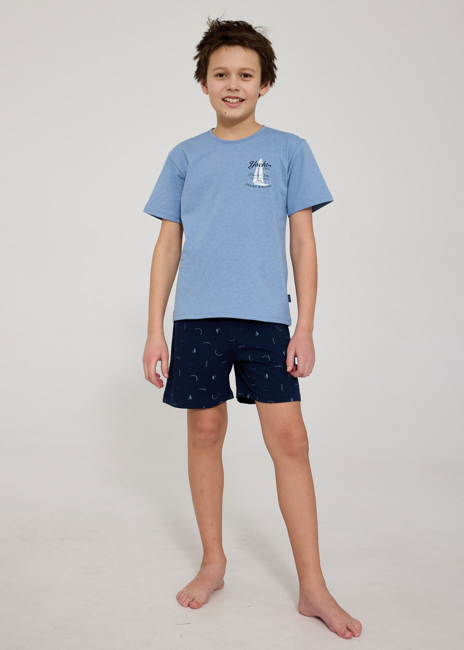chlapčenské pyžamo s krátkym rukávom a krátkymi nohavicami, všívaná široká guma v páse nohavíc. Pyžamo je vyrobené z bavlneného úpletu.