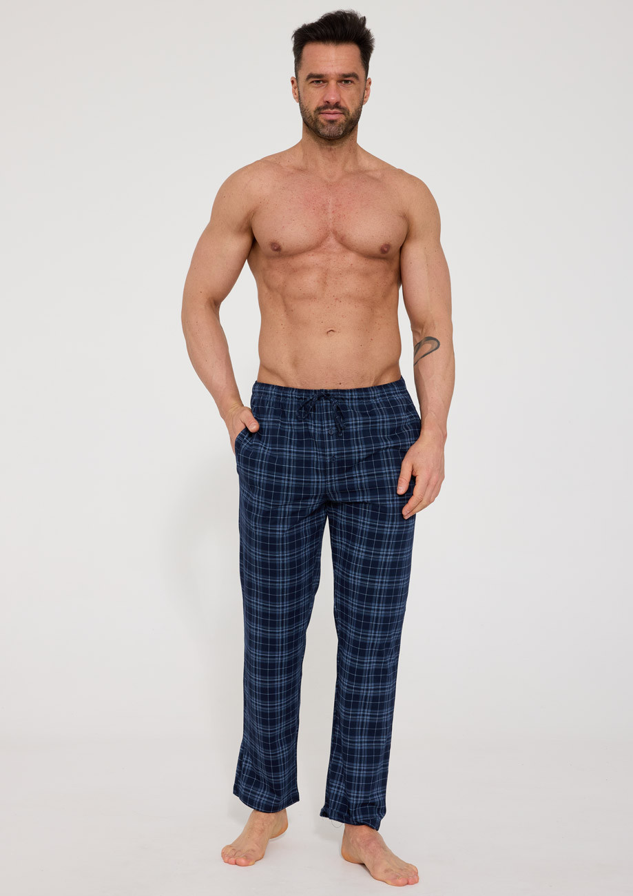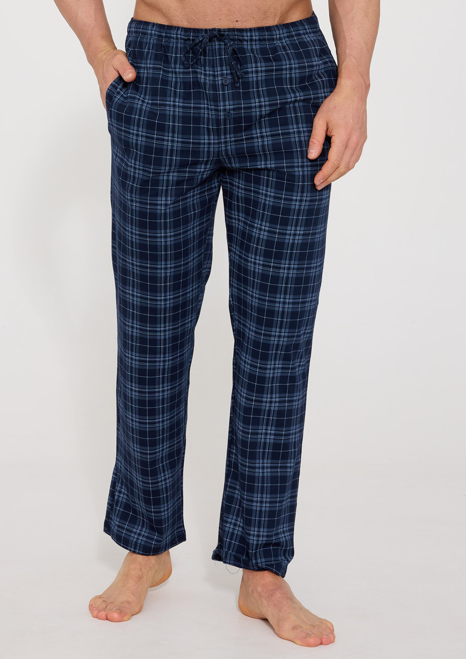 pánske dlhé pyžamové nohavice s bočnými vreckami vyrobené z kvalitného 100% bavlneného úpletu. V páse je všívaná široká guma a tunel so šnúrkou na sťahovanie.