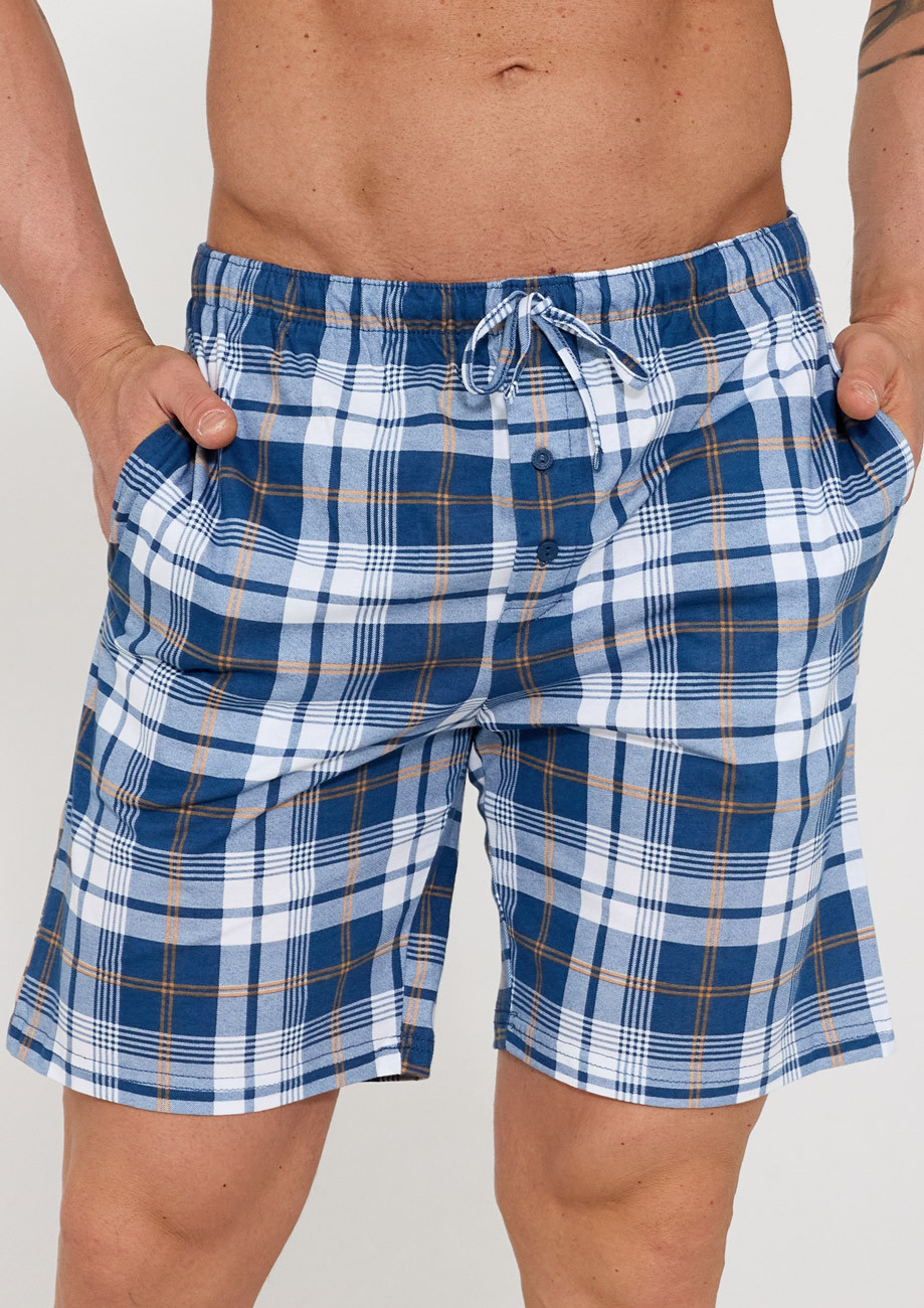 Pánske krátke pyžamové nohavice s bočnými vreckami vyrobené z kvalitného 100% bavlneného úpletu. V páse je všívaná široká guma a tunel so šnúrkou na sťahovanie.