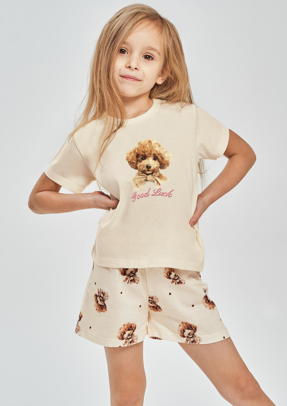 Dievčenské pyžamo s krátkym rukávom a krátkymi nohavicami vyrobené z úpletu zo 100% bavlny. Všívaná guma v páse nohavíc.