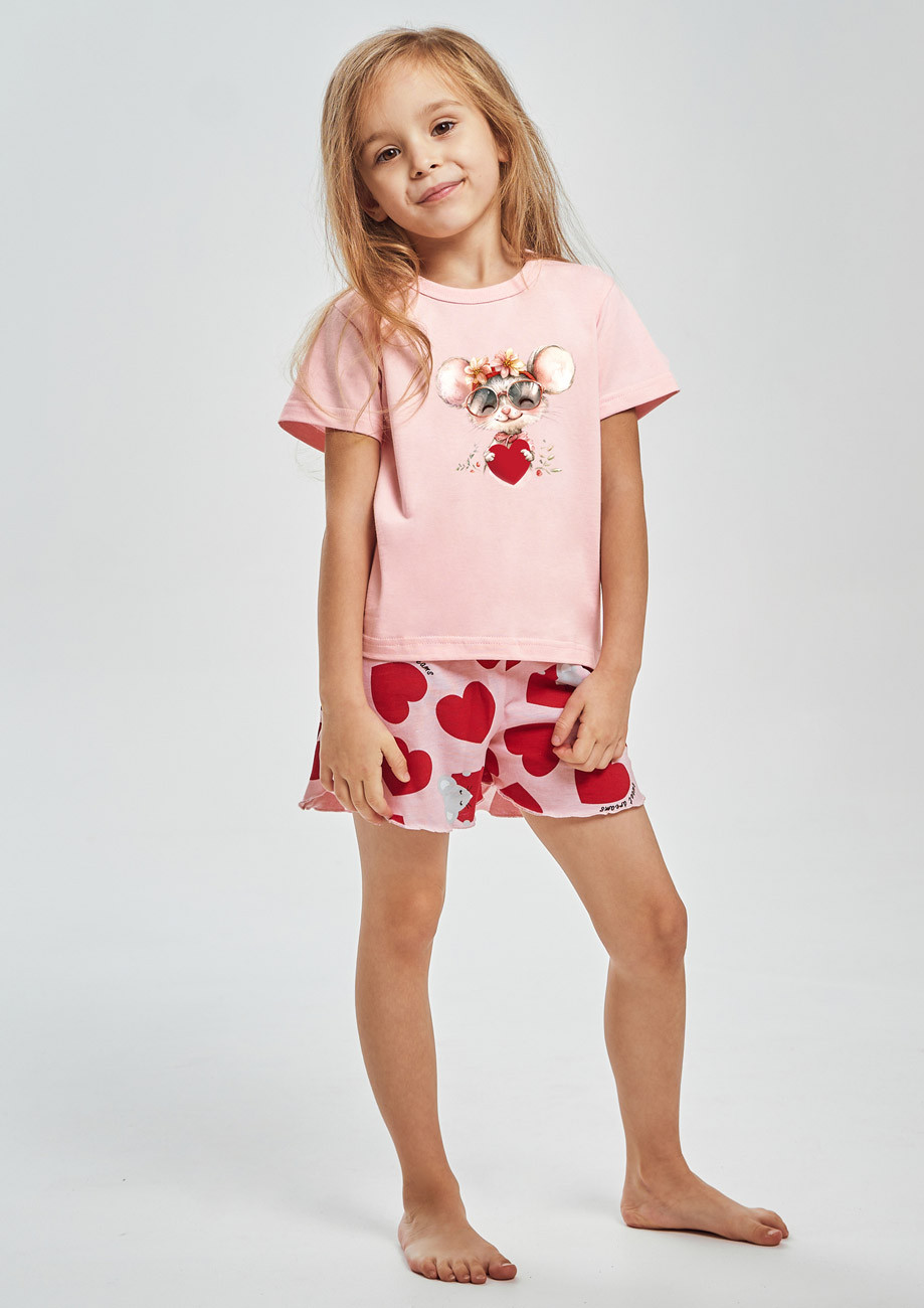 Dievčenské pyžamo s krátkym rukávom a krátkymi nohavicami vyrobené z úpletu zo 100% bavlny. Všívaná guma v páse nohavíc.