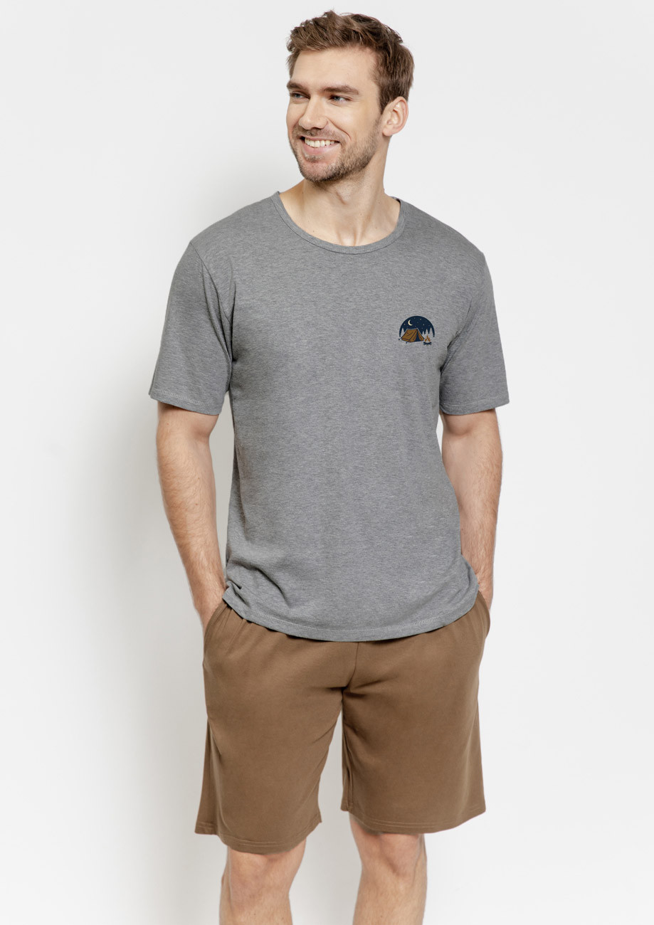 Pánske pyžamo s krátkym rukávom a krátkymi nohavicami vyrobené z bavlneného úpletu. Pohodlná široká všívaná guma v páse nohavíc.