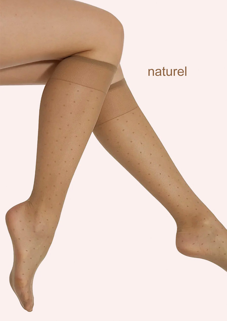 dámske jemne vzorované podkolienky bez zosilnenej päty so širokým lemom, 1 pár v balení, 20den. Sú vyrobené z opletenej priadze pre zvýšenú odolnosť, sú flexibilné a jemné na dotyk.