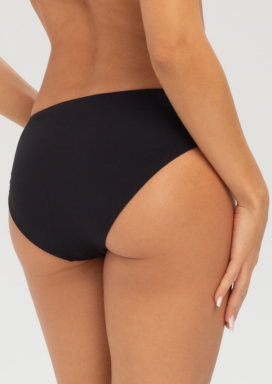 Tieto nohavičky sú v tmavom prevedení s jemný vzorom, ktoré necháva vyniknúť pestrému vrchu a krásne s ním ladí. Klasický strih so spevneným pásom zabezpečuje, že nohavičky zostanú na mieste aj pri dynamickom pohybe vo vode.