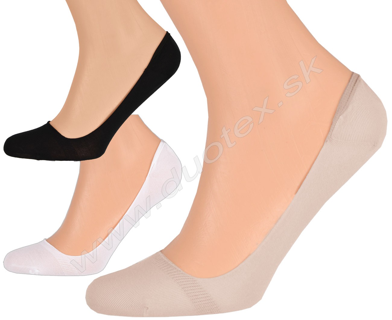 dámske jednofarebné elastické ponožky vhodné do mokasín vyrobené z tenkej nepriehľadnej bavlny. Netlačiaci elastický prúžok po obvode chodidla fixuje ponožku proti posuvu.