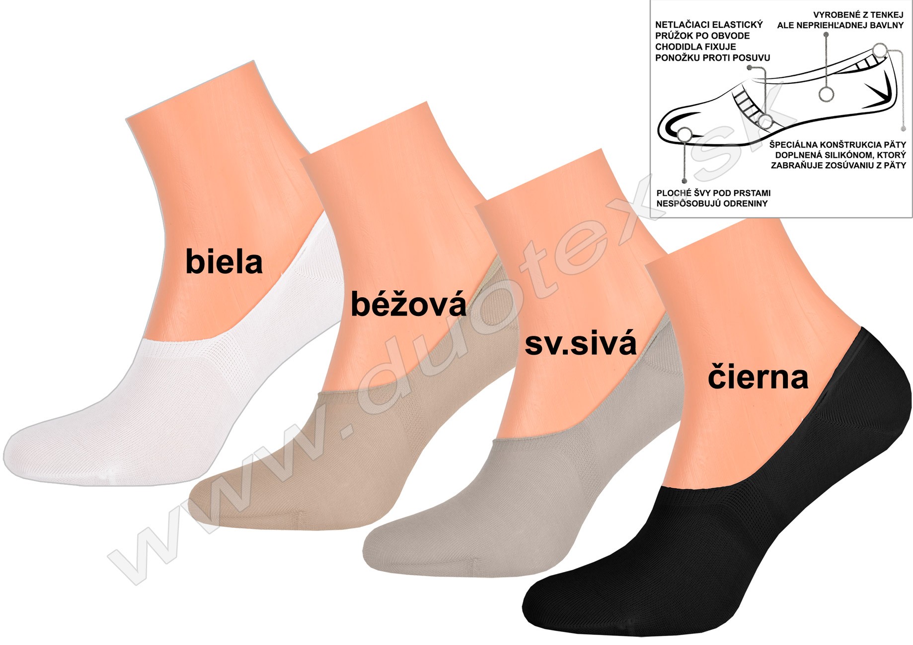 tenké jednofarebné pánske elastické ponožky vhodné do mokasín. Špeciálna konštrukcia päty doplnená silikónom zabraňuje zosúvaniu ponožky z päty. Netlačiaci elastický prúžok po obvode chodidla fixuje ponožku proti posuvu.