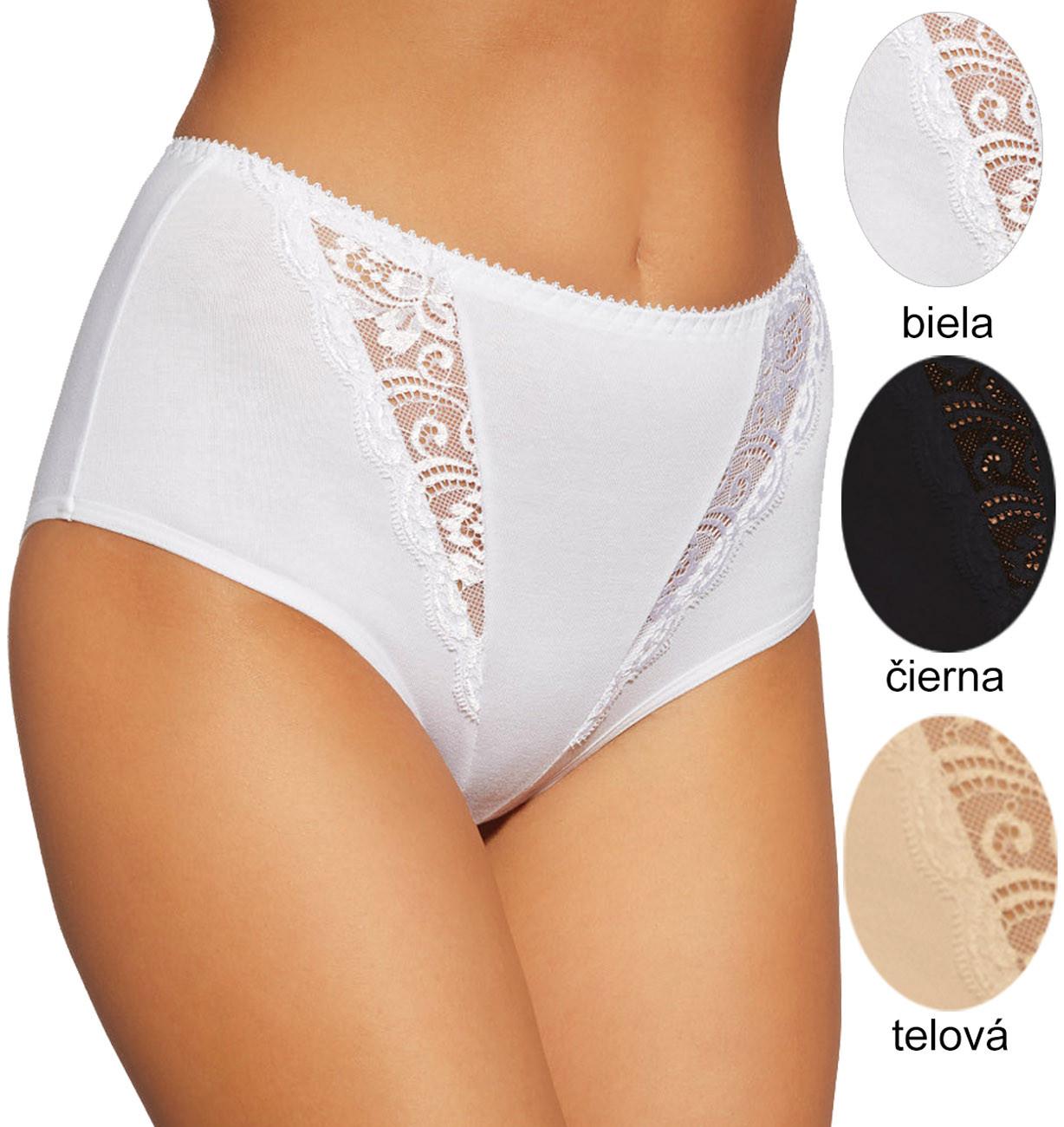 dámske nohavičky - kombinácia elastickej krajky a mäkkého úpletu, zadný diel z hladkého úpletu - s vysokými bokmi