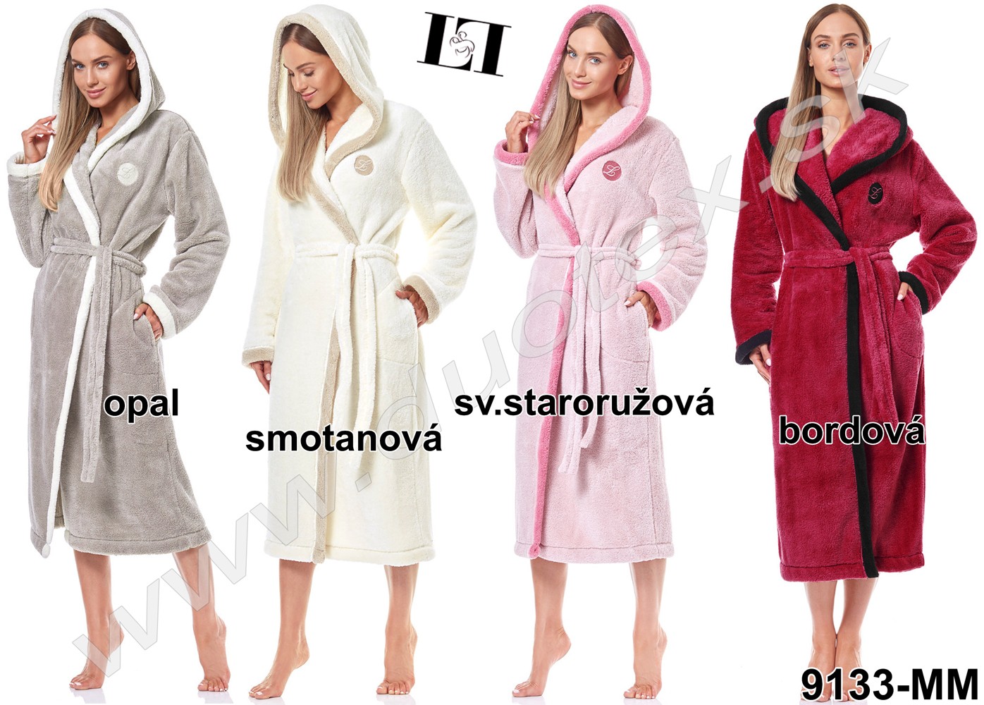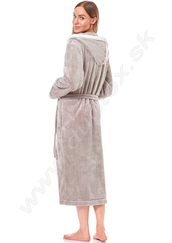 dámsky dlhý zavinovací župan s kapucňou vyhotovený z mäkkučkého hrubého postrihovaného plyšu, všívané bočné vrecká