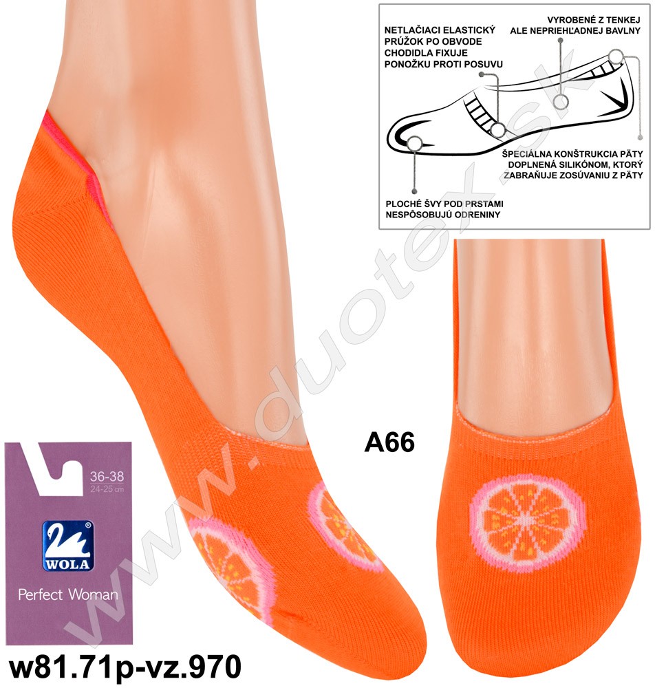 dámske tenké jemne vzorované elastické ponožky vhodné do mokasín. Špeciálna konštrukcia päty doplnená silikónom zabraňuje zosúvaniu ponožky z päty. Netlačiaci elastický prúžok po obvode chodidla fixuje ponožku proti posuvu.