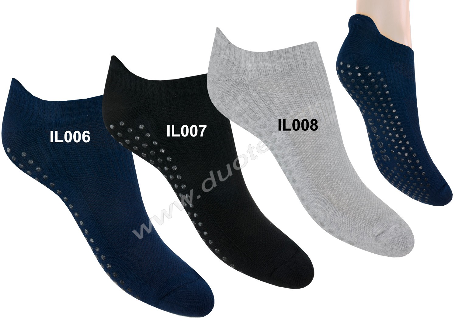 elastické bavlnené členkové ponožky s ABS - froté v spodnej časti chodidla, s plochým švom na špičke a priedušnou väzbou na nárte. Elastický prúžok okolo nartu lepšie fixuje ponožku na nohe a bráni jej zosúvaniu a pretáčaniu.