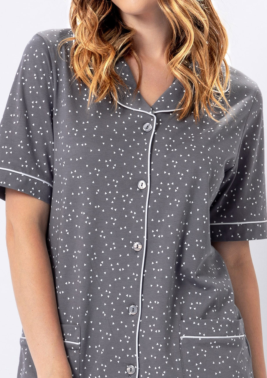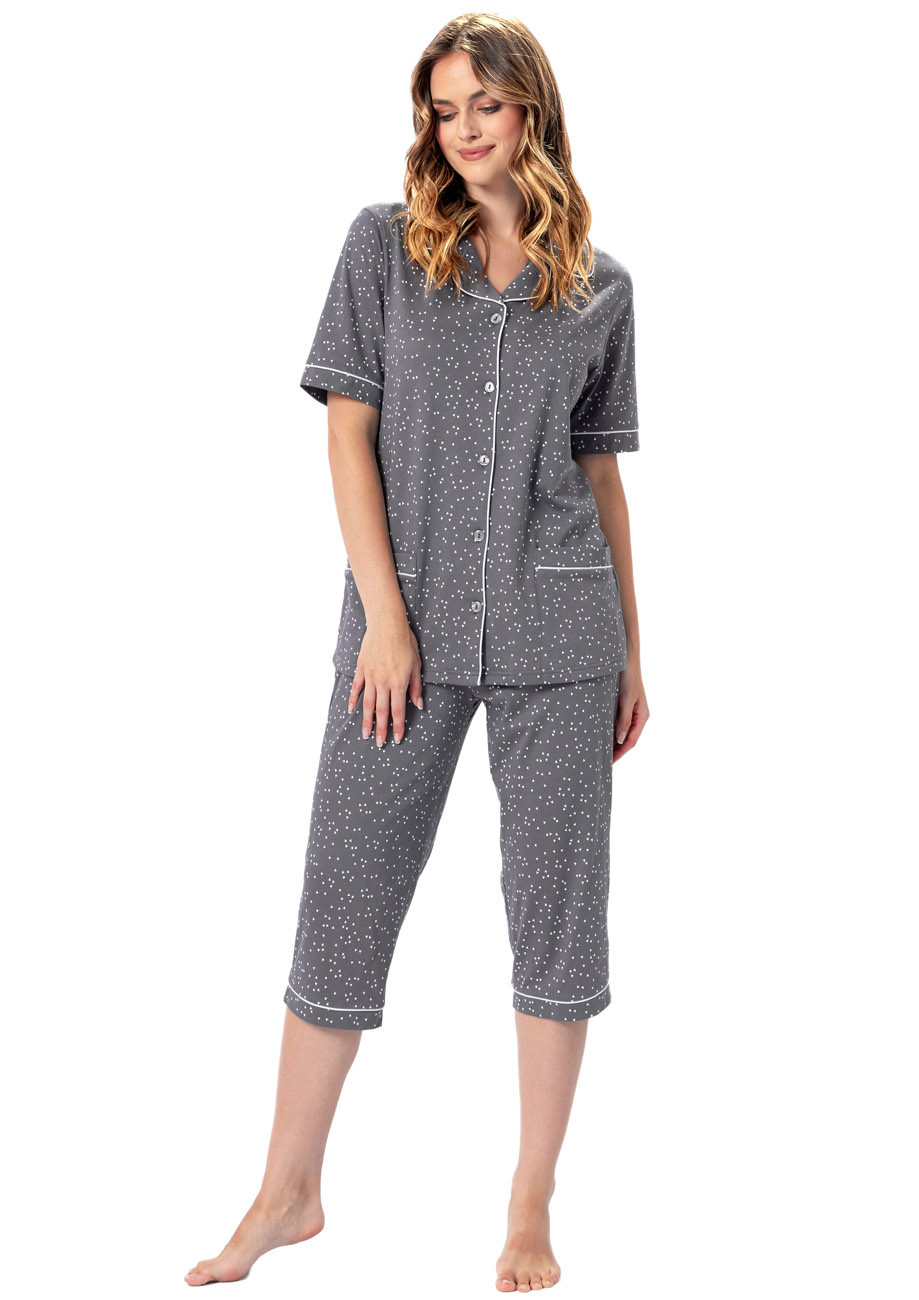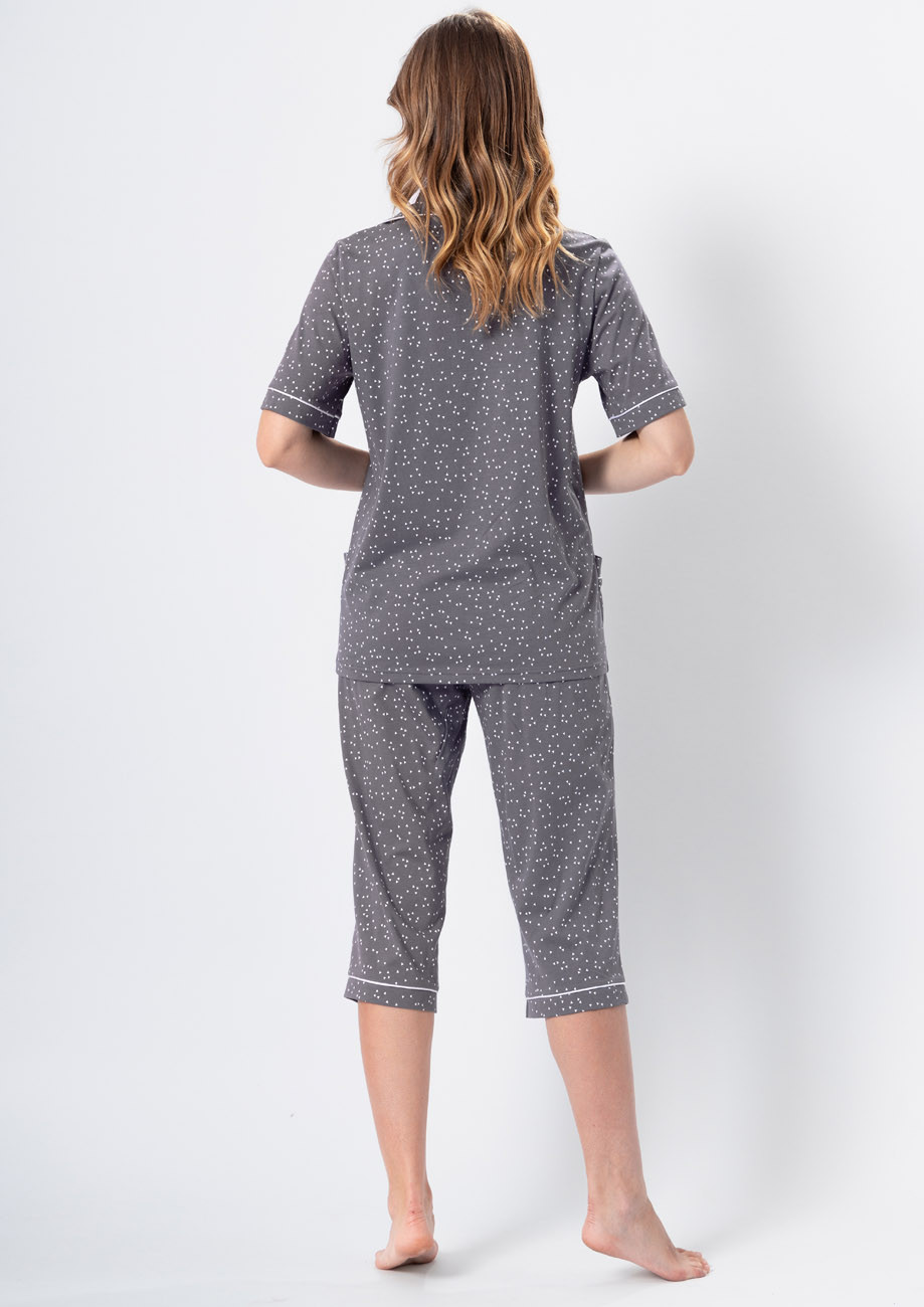 dámske pyžamo s krátkym rukávom a 3/4 nohavicami, predný diel na rozopínanie. Je vyrobené zo 100% bavlny - všívaná guma v páse nohavíc